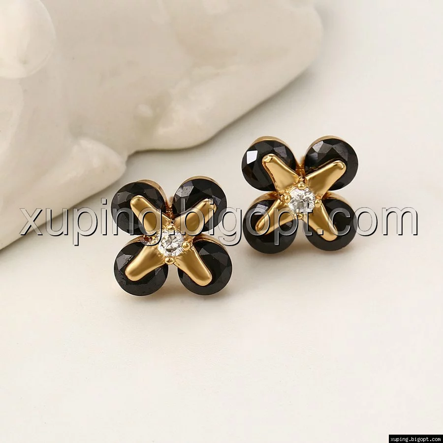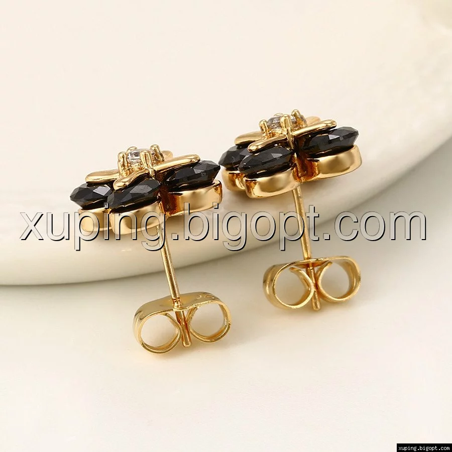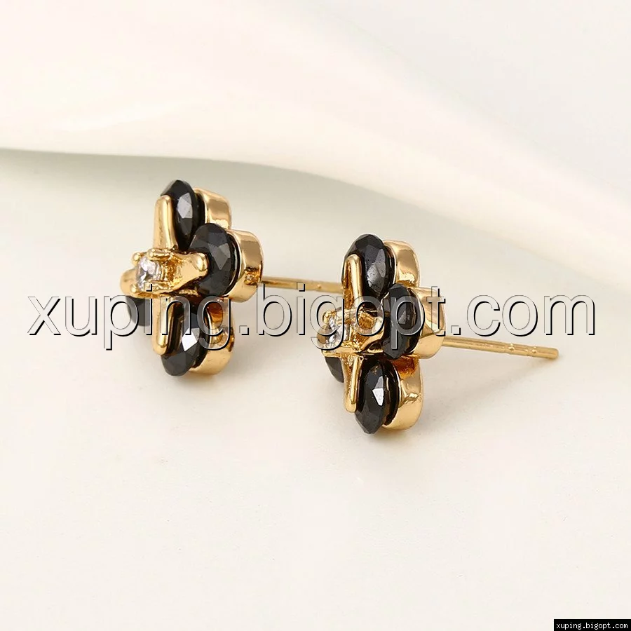 Серьги гвоздики, Цветок с черным цирконием, позолота
