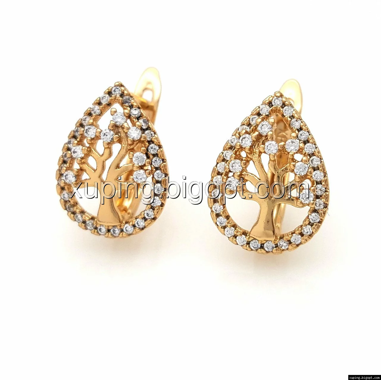 Серьги Капелька с Ажурным деревом, вставка цирконий, англ.замок, позолота Xuping
