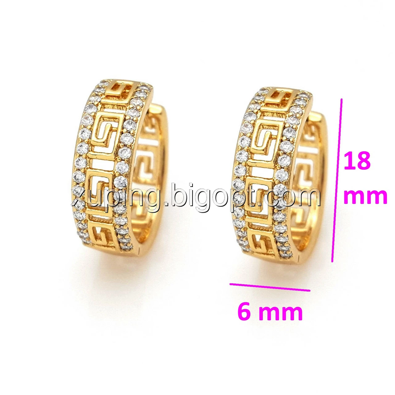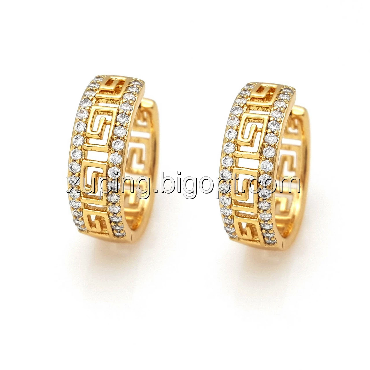 Серьги колечка, Две Дорожки с камнями и греческим рисунком, позолота