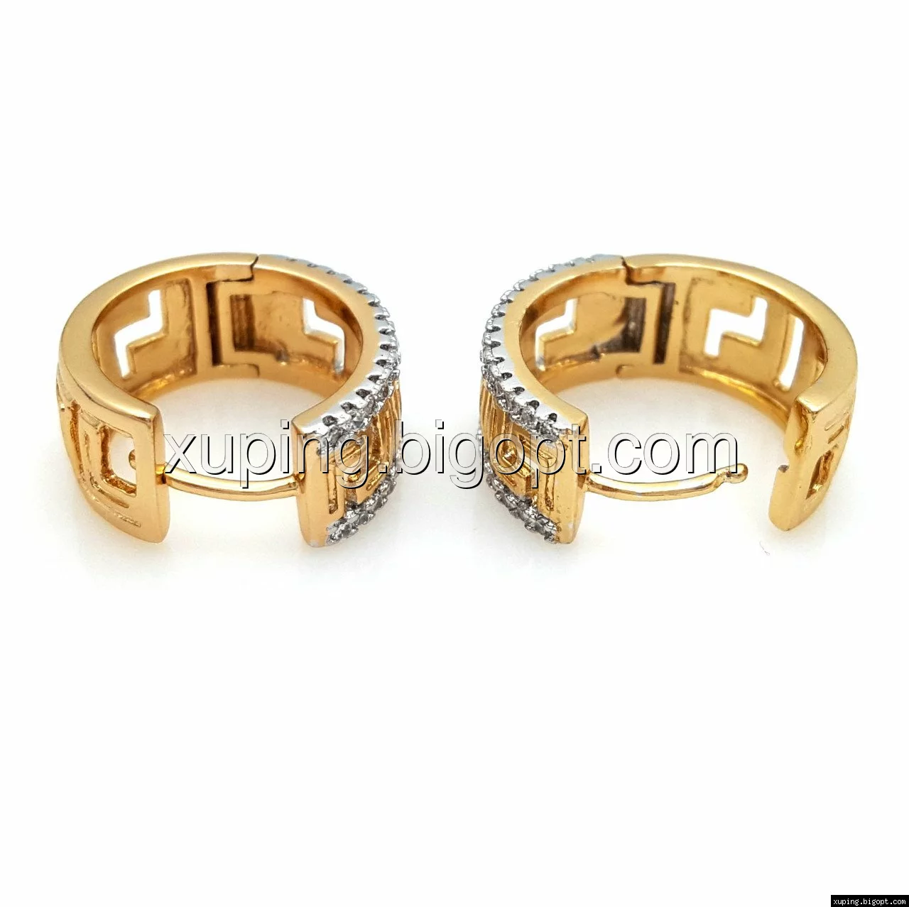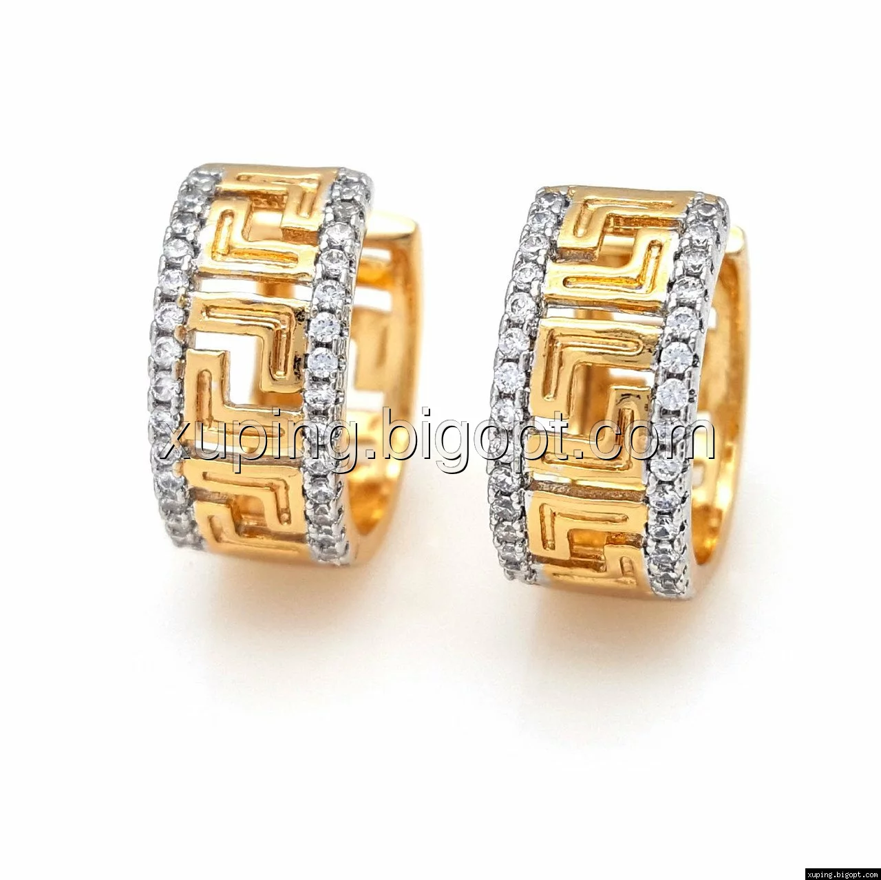 Серьги Колечка с греческим рисунком и вставками циркония, позолота+родий, Xuping