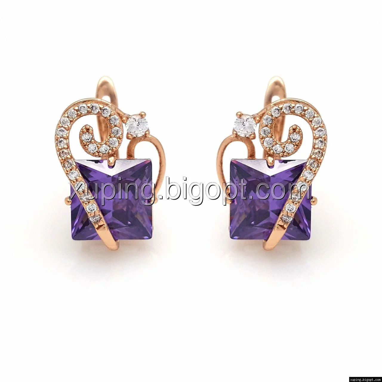Серьги Квадрат с завитком, фиолетовый цирконий, англ.замок, позолота 14К