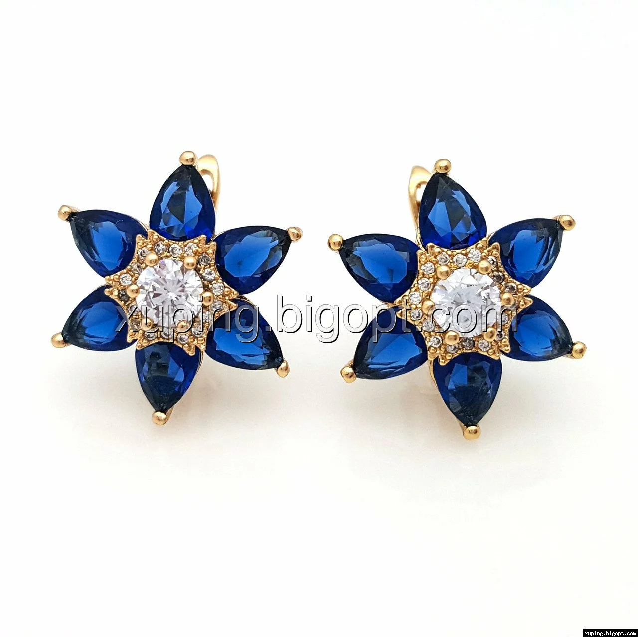 Серьги Большой Цветок, с синим цирконием, англ.замок, позолота
