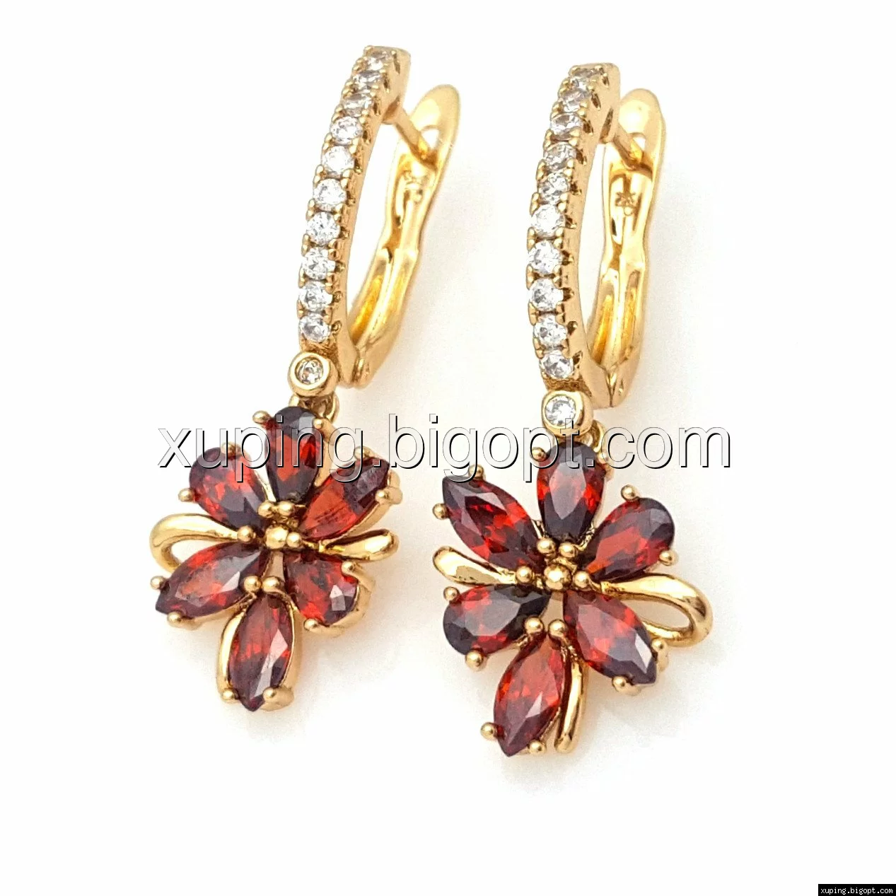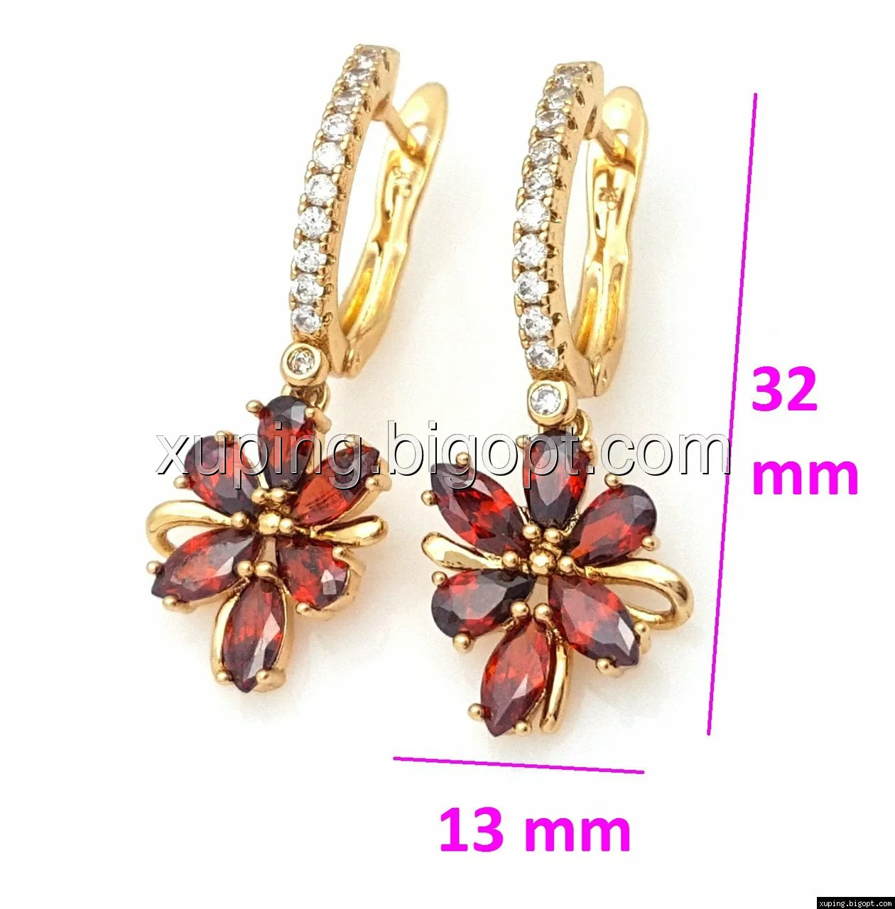 Серьги позолота Xuping 704754, Цветок с красными камнями, англ.замок