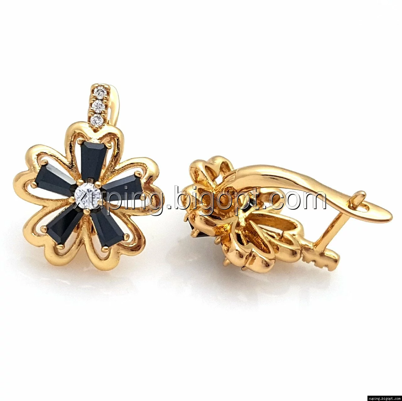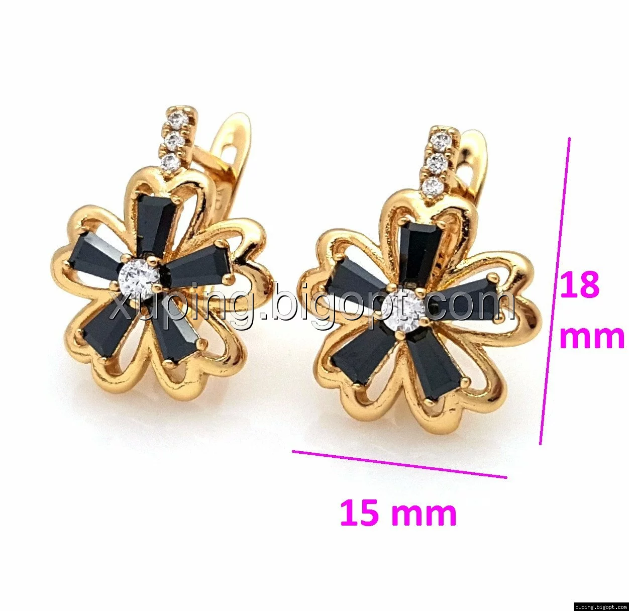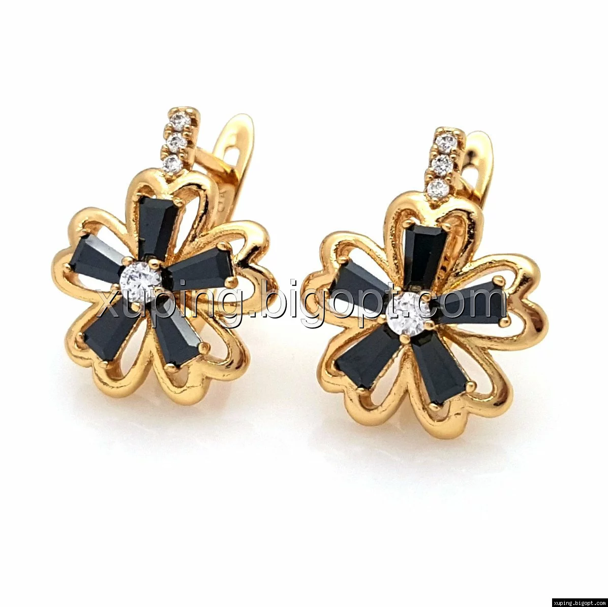 Сережки позолочені, Ажурна Квітка, з чорним цирконієм, англ.замок, Xuping, 18К