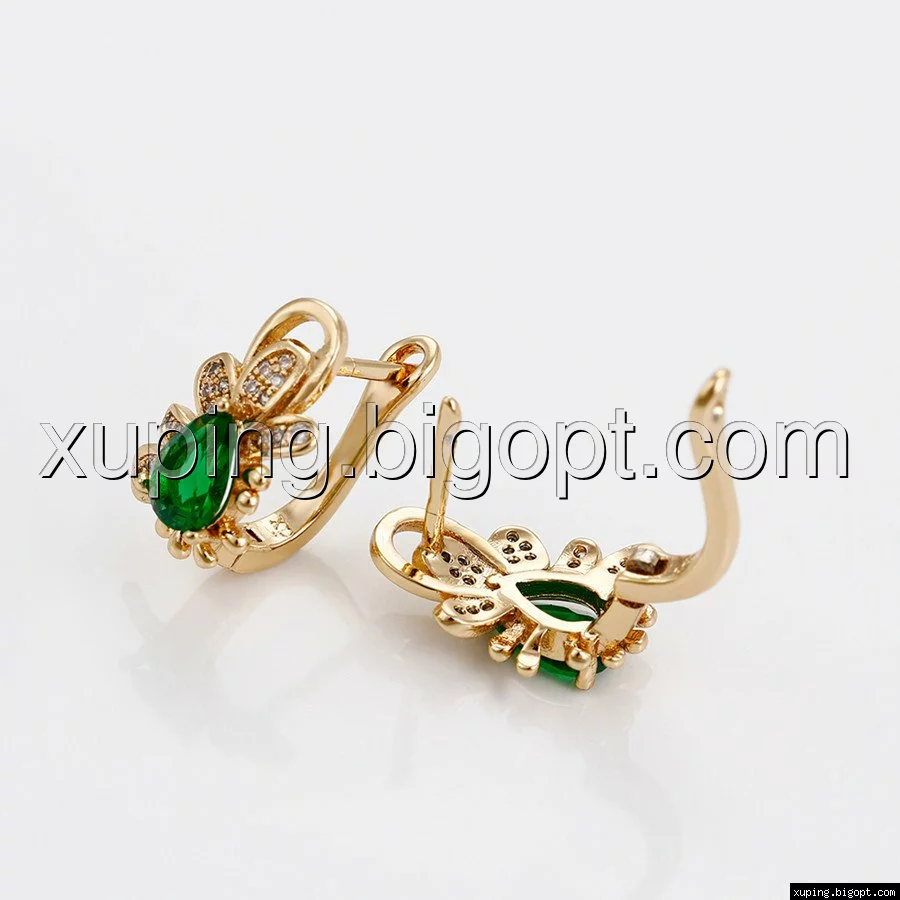 Сережки позолочені, Лісова Квітка, зелений цирконій, англ.замок, Xuping, 18К
