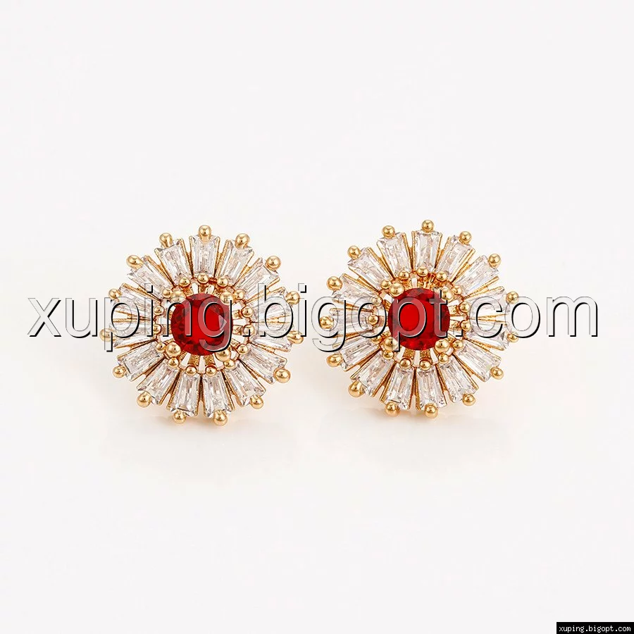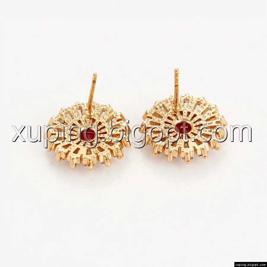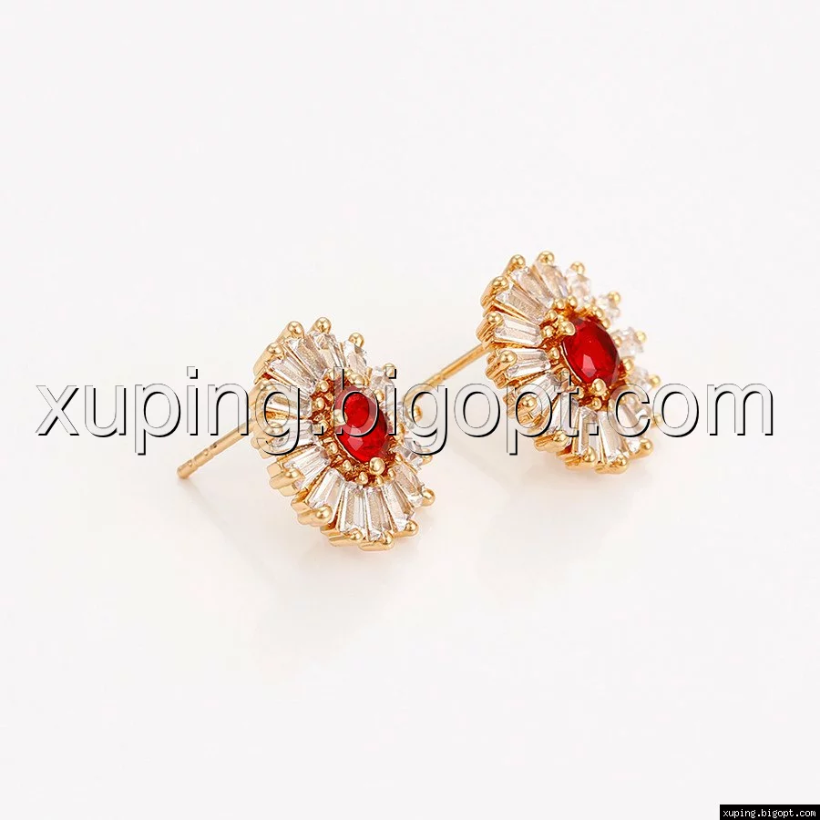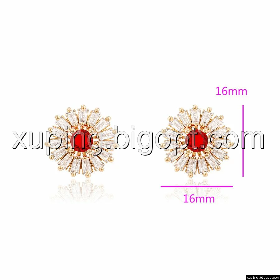 Серьги позолоченные, Ромашка с красным цирконием, гвоздики