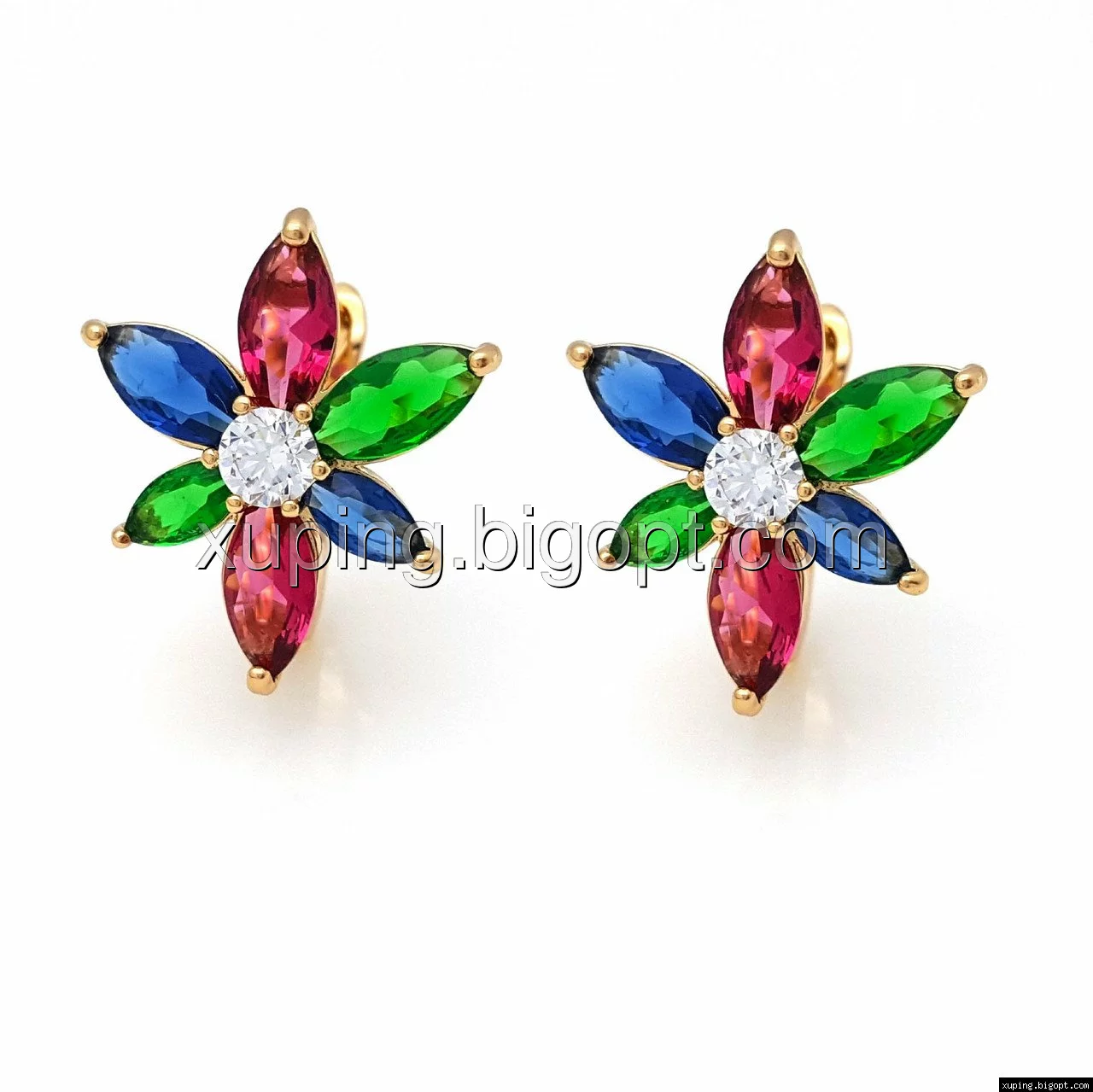 Серьги позолоченные, Цветок с разноцветным цирконием, англ.замок