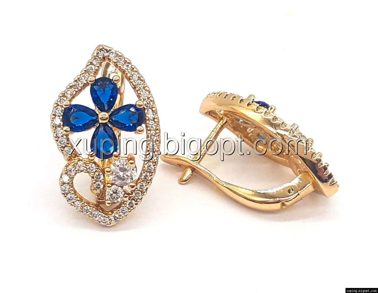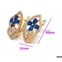 Сережки позолочені, Фігурний Овал з квіткою, вставка синій цирконій, Xuping, 18К англ.замок,