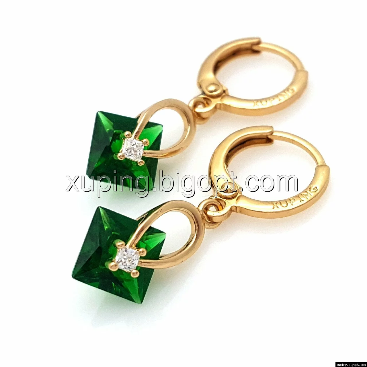 Серьги позолоченные, Висюльки с зеленым цирконием, Xuping