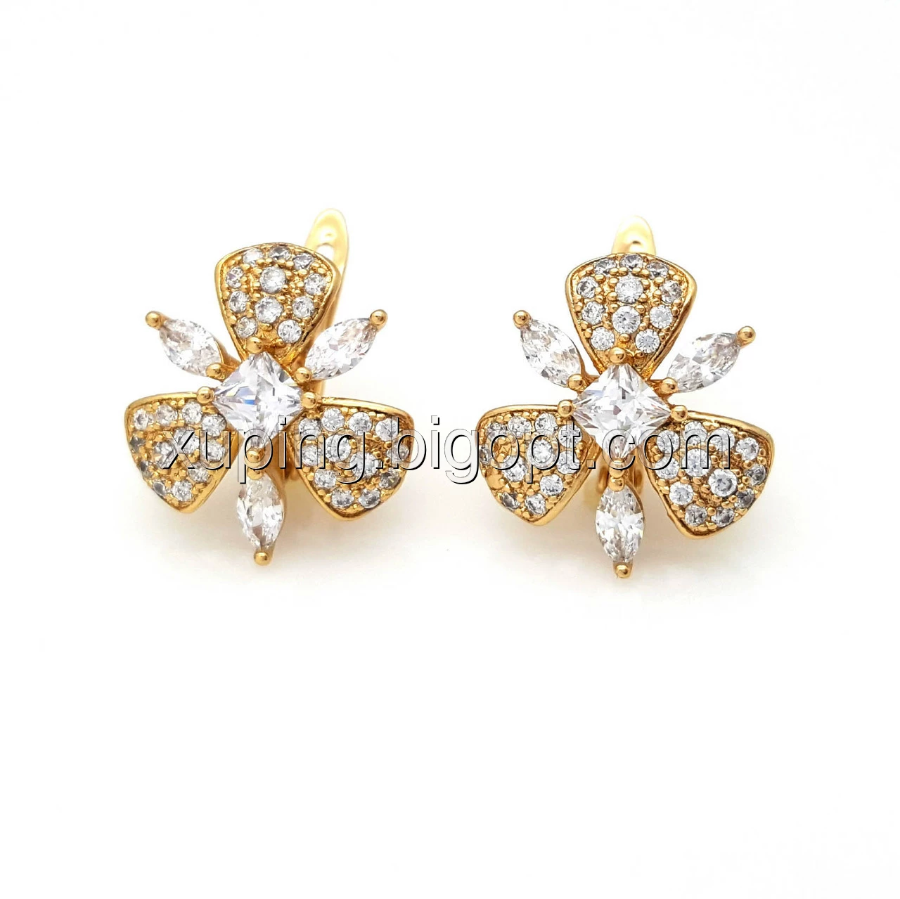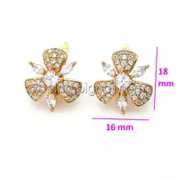 Серьги Цветок-Трилистник, в россыпи камней, англ.замок, позолота