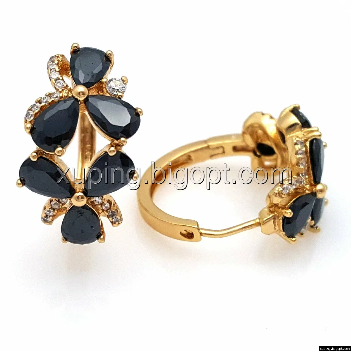 Серьги Два Цветка, с черным цирконием, позолота Xuping
