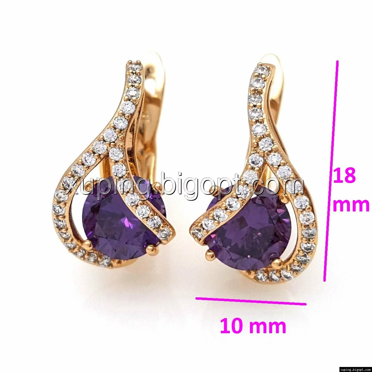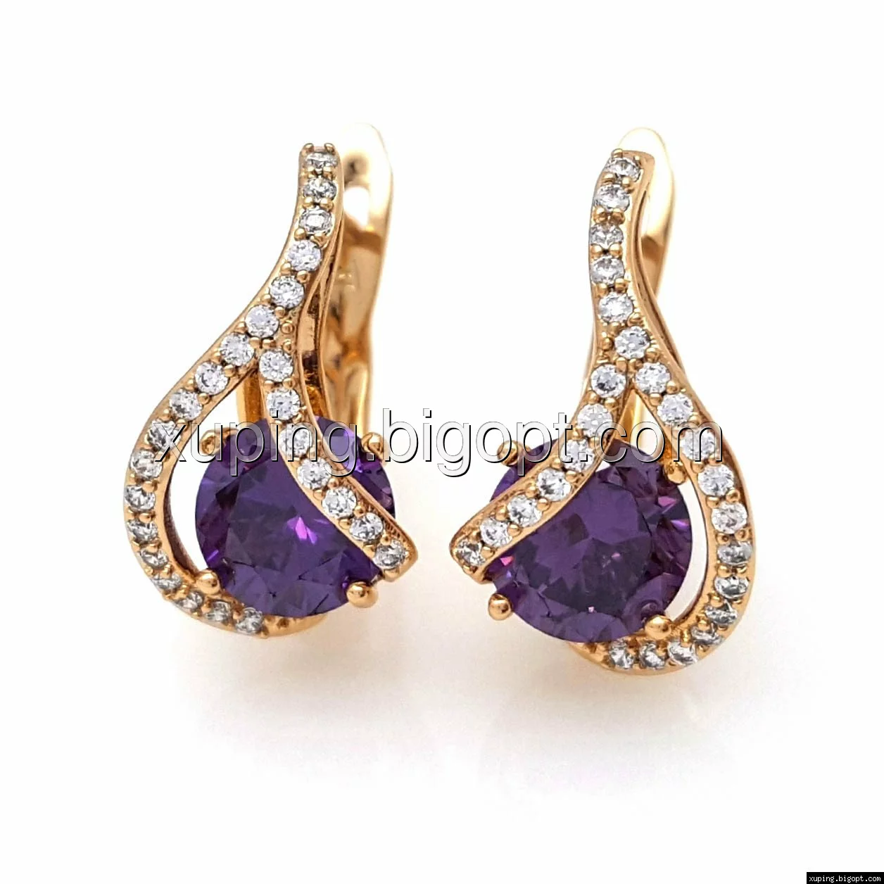 Серьги Завиток, с фиолетовым цирконием, англ.замок, позолота Xuping