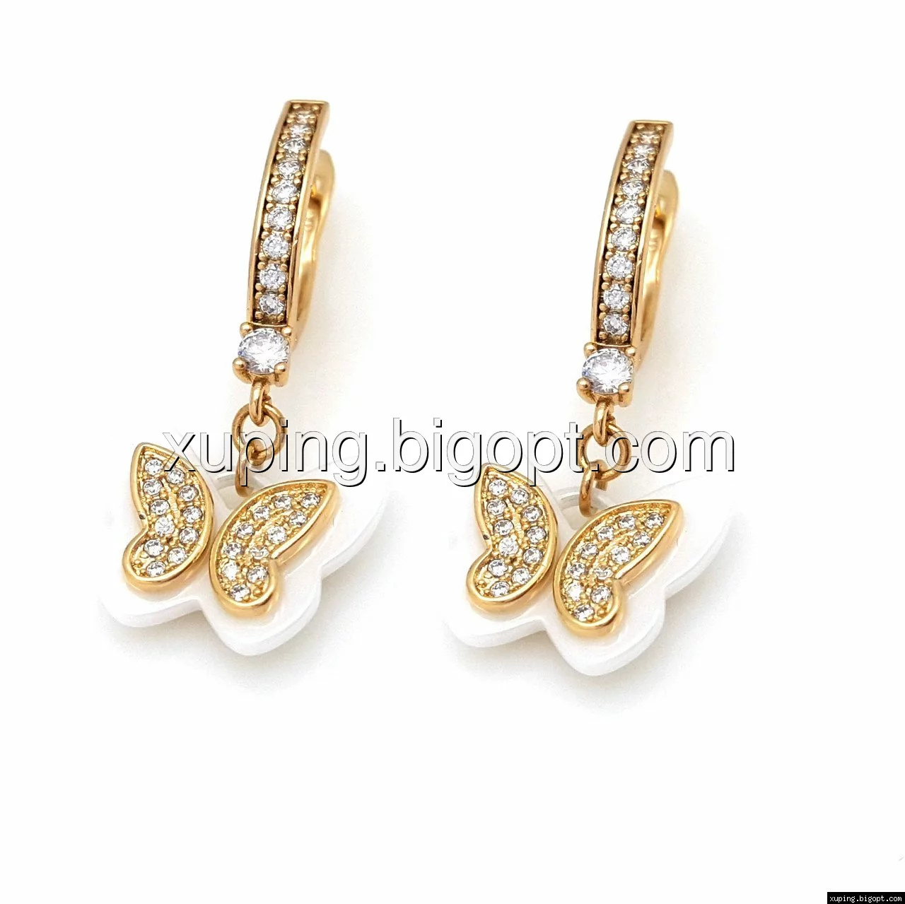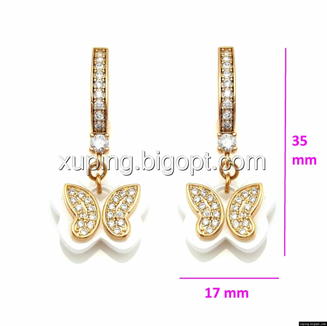 Серьги висюльки, Бабочка с белой керамики и камнями, англ.замок, позолота Xuping