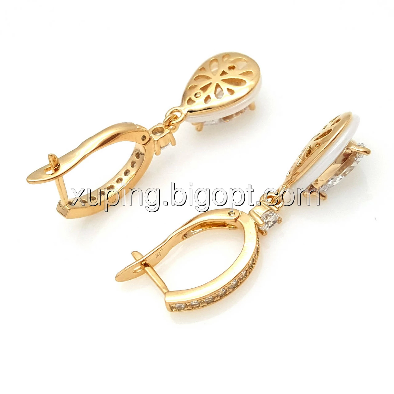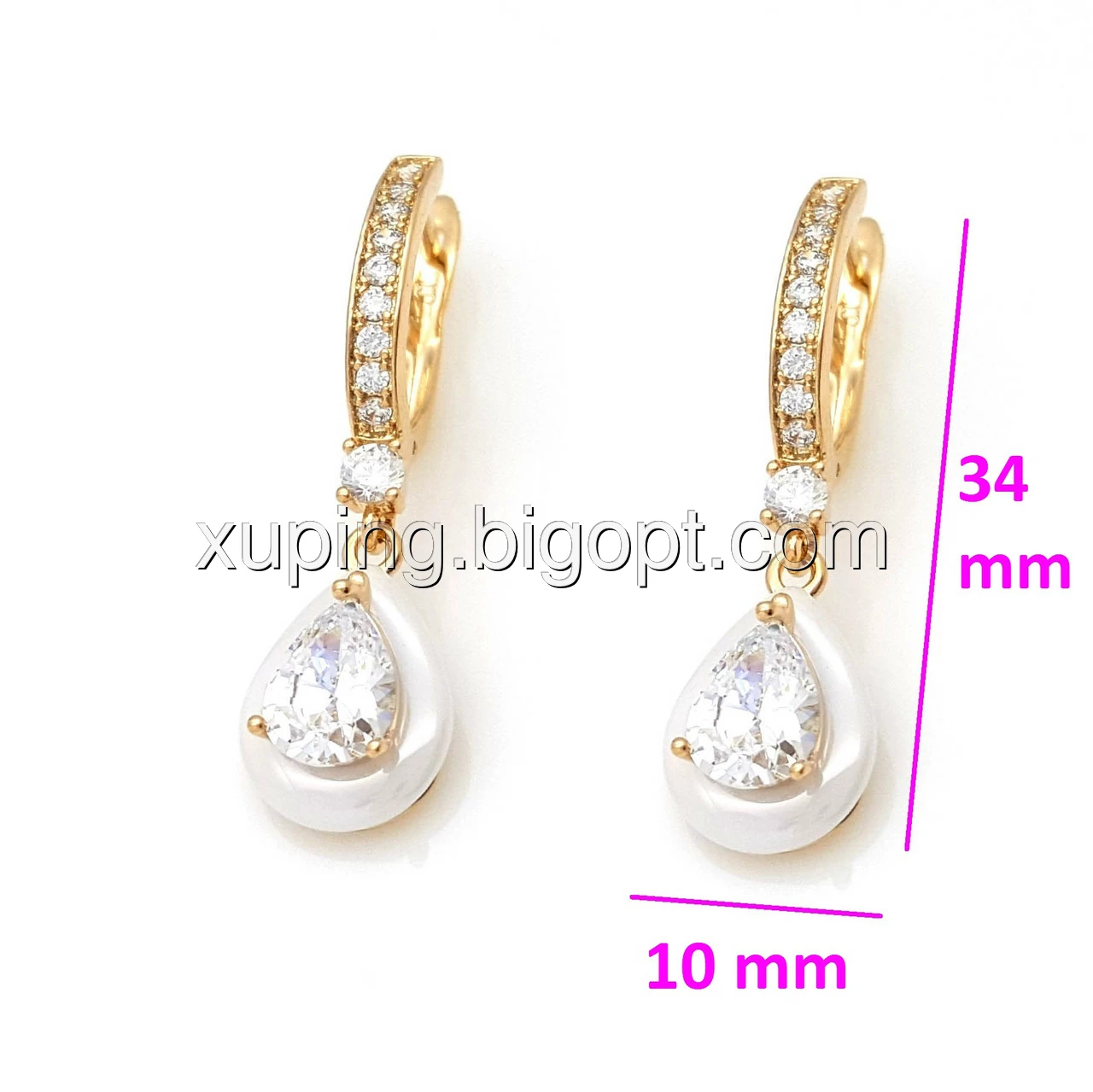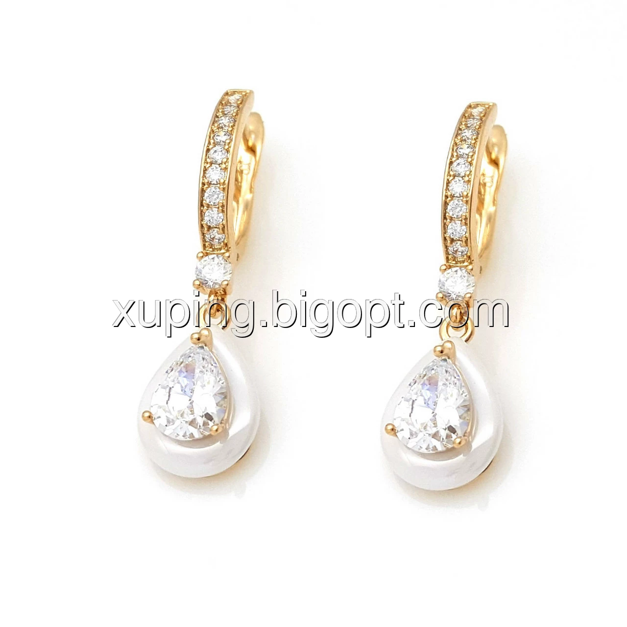 Серьги висюльки, Капелька с белой керамики, вставка цирконий, англ.замок, позолота