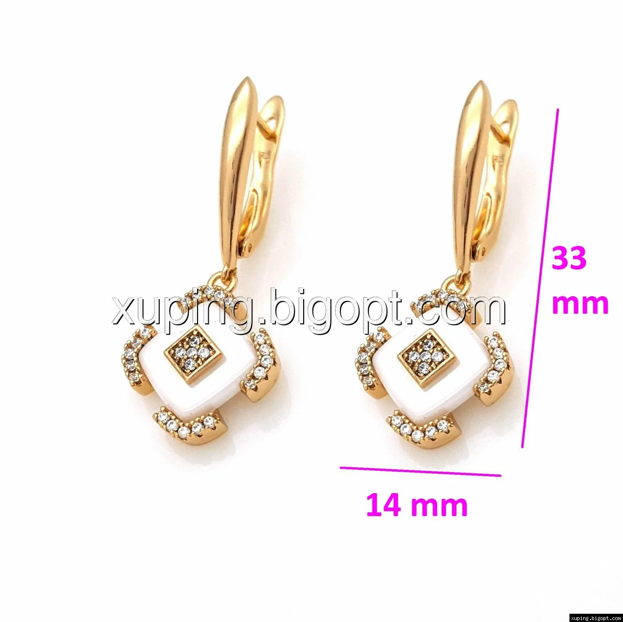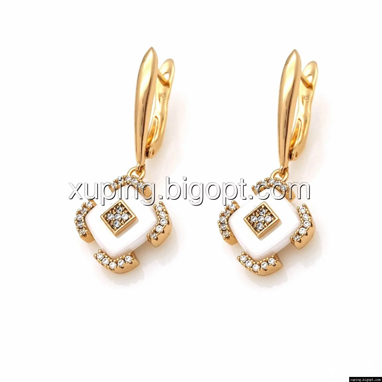 Серьги висюльки, Ромб с белой керамики, вставка цирконий, англ.замок, позолота