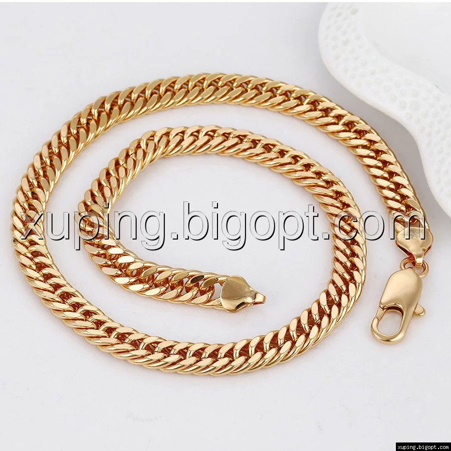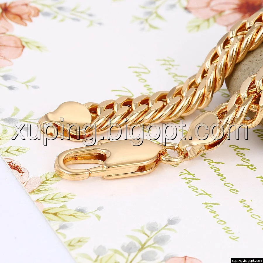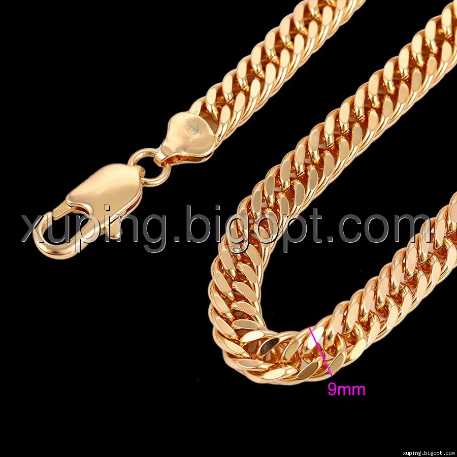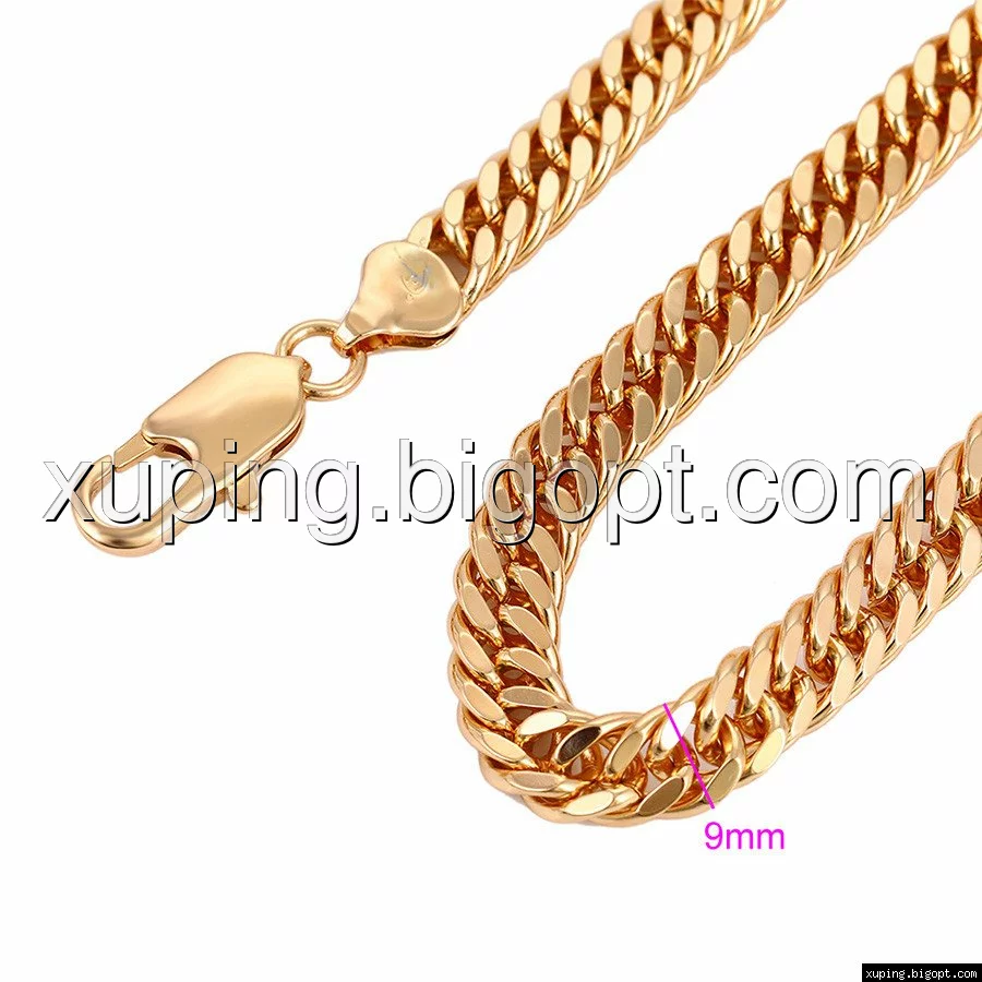 Цепочка выполнена из медицинского сплава на основе латуни с добавлением легирующих элементов, с целью улучшения каких-либо ее свойств, например коррозионной стойкости или прочности. Такой сплав не вызывает аллергии, не вступает в реакцию с потом человека, не меняет свои свойства под воздействием соленой воды и солнца. Поверхность цепочки покрыта золотом 18 карата.