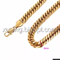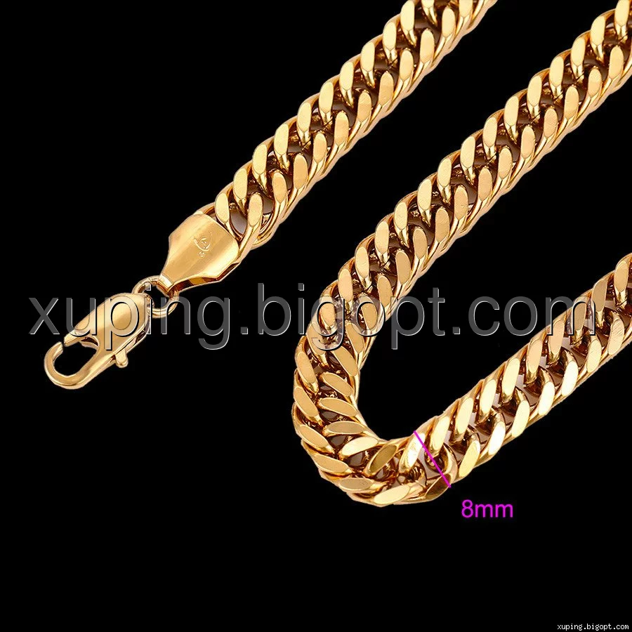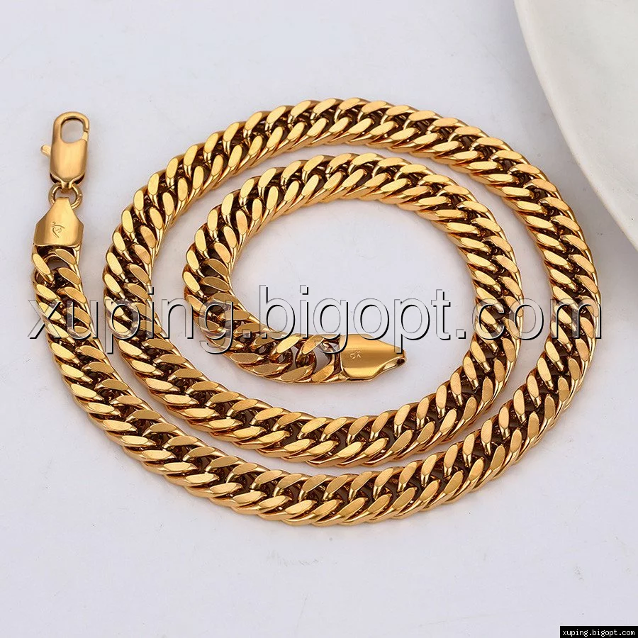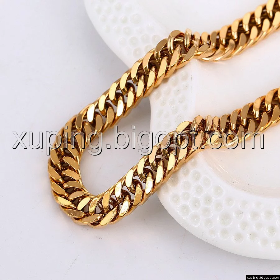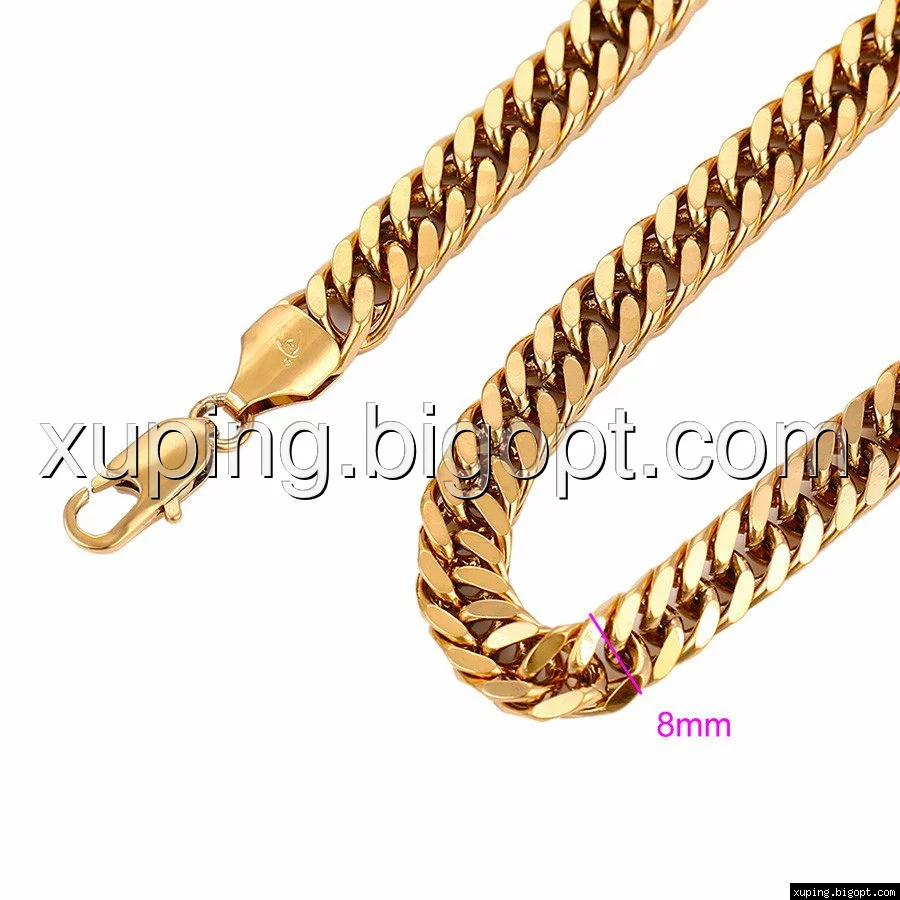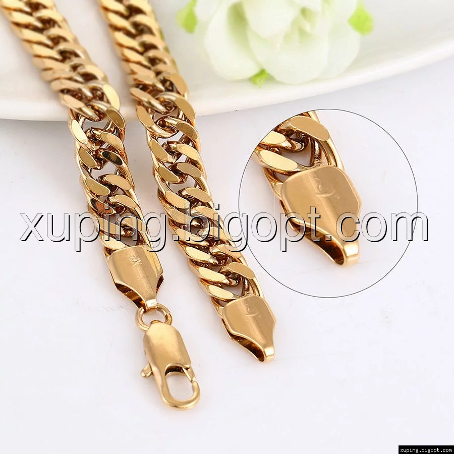 Цепочка выполнена из медицинского сплава на основе латуни с добавлением легирующих элементов, с целью улучшения каких-либо ее свойств, например коррозионной стойкости или прочности. Такой сплав не вызывает аллергии, не вступает в реакцию с потом человека, не меняет свои свойства под воздействием соленой воды и солнца. Поверхность цепочки покрыта золотом 18 карата.