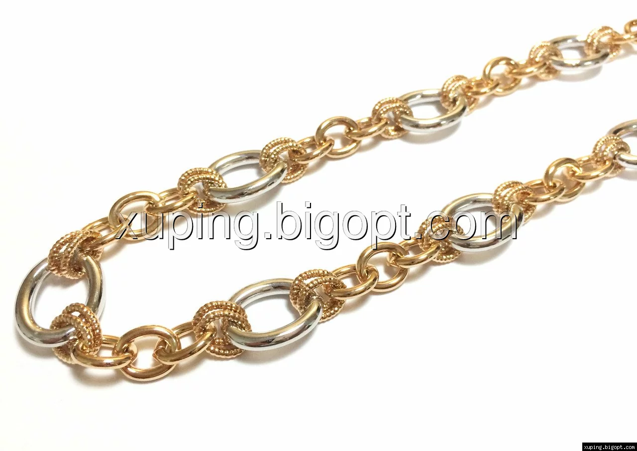 Цепочка выполнена из медицинского сплава на основе латуни с добавлением легирующих елементов, с целью улучшения каких-либо ее свойств, например коррозионной стойкости или прочности. Такой сплав не вызывает аллергии, не вступает в реакцию с потом человека, не меняет свои свойства под воздействием соленой воды и солнца. Поверхность цепочки покрыта золотом 18 карата.