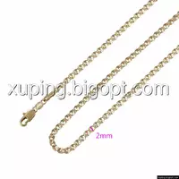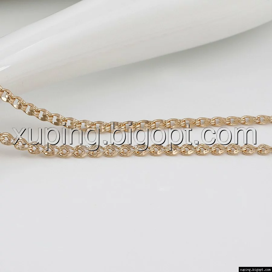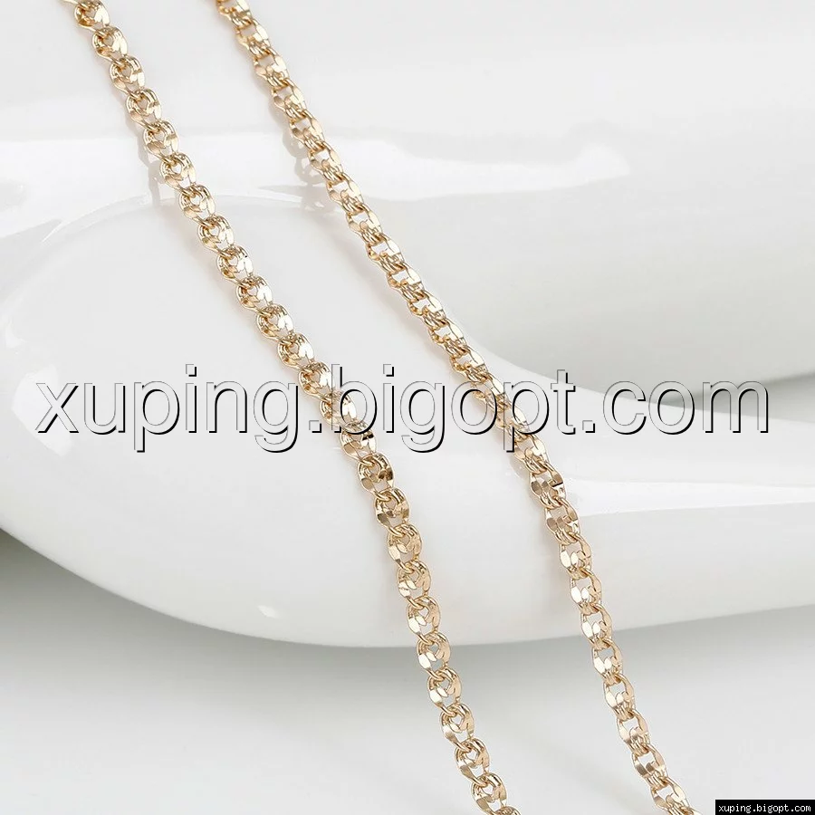 Цепочка выполнена из медицинского сплава на основе латуни с добавлением легирующих элементов, с целью улучшения каких-либо ее свойств, например коррозионной стойкости или прочности. Такой сплав не вызывает аллергии, не вступает в реакцию с потом человека, не меняет свои свойства под воздействием соленой воды и солнца. Поверхность цепочки покрыта золотом 18 карата.
