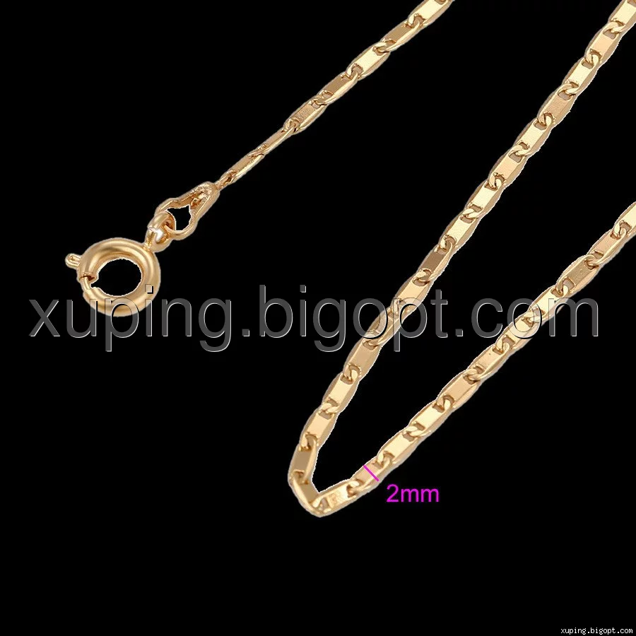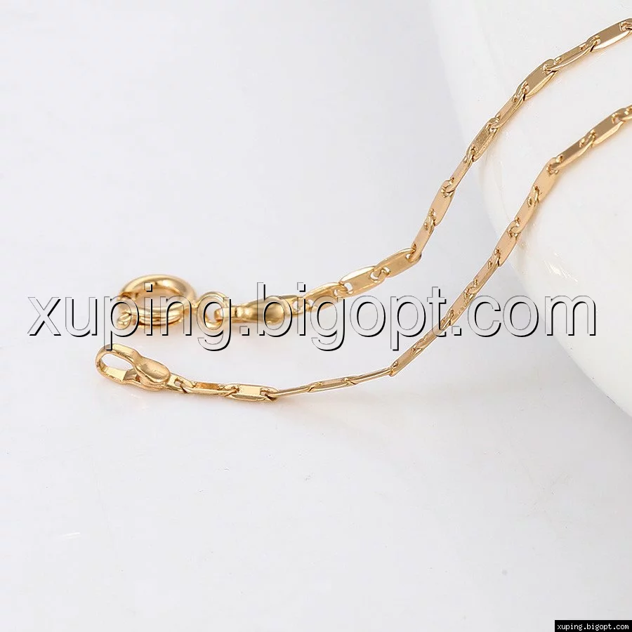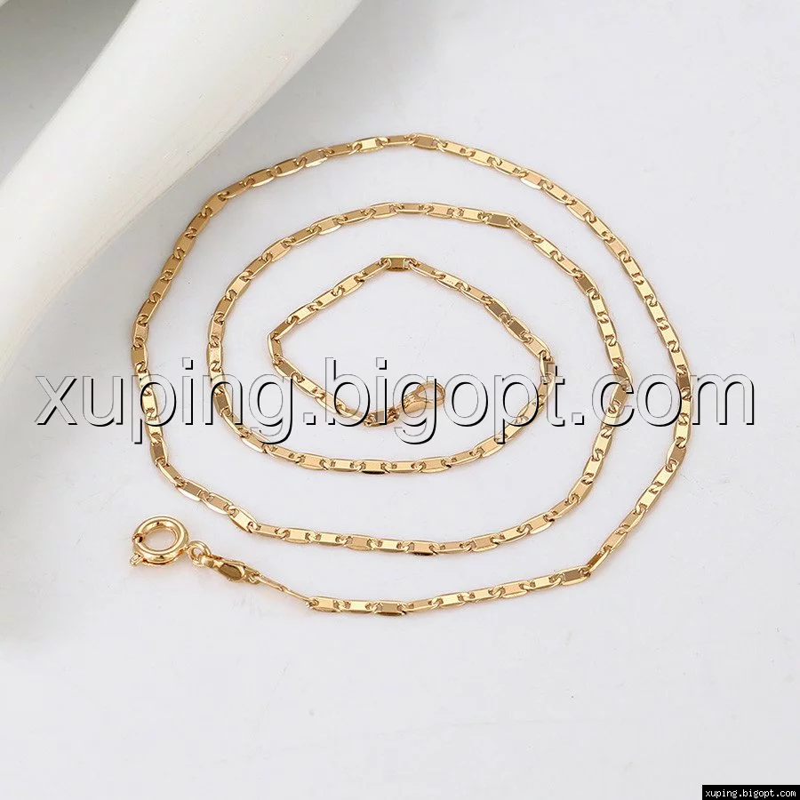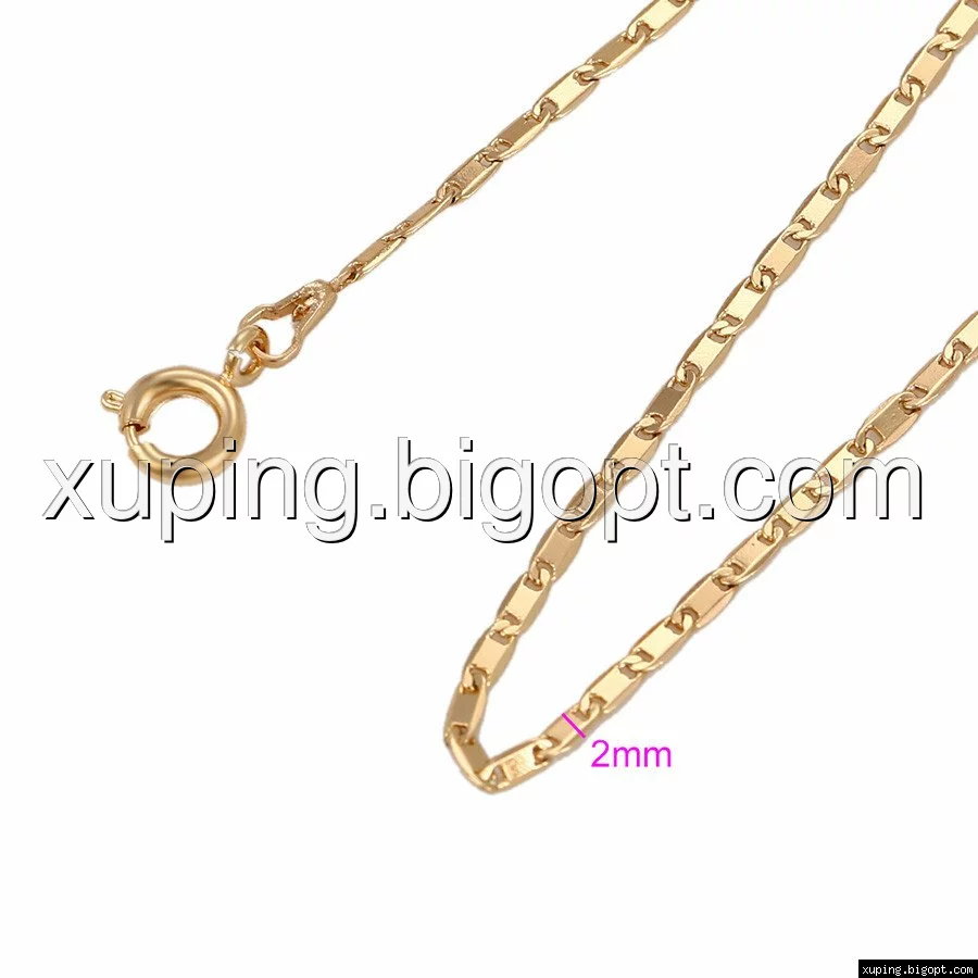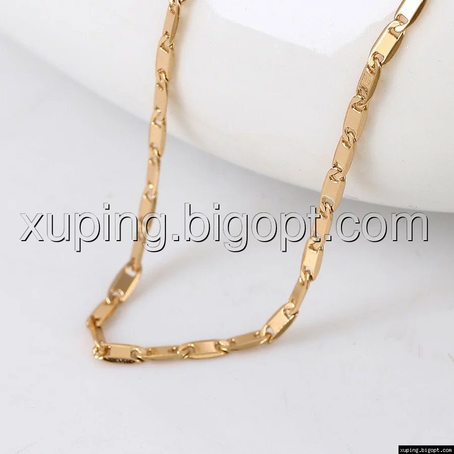 Цепочка выполнена из медицинского сплава на основе латуни с добавлением легирующих элементов, с целью улучшения каких-либо ее свойств, например коррозионной стойкости или прочности. Такой сплав не вызывает аллергии, не вступает в реакцию с потом человека, не меняет свои свойства под воздействием соленой воды и солнца. Поверхность цепочки покрыта золотом 18 карата.