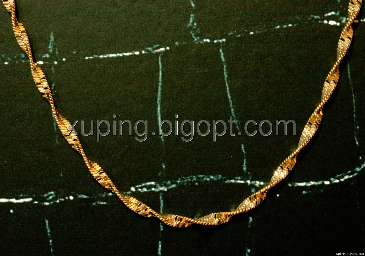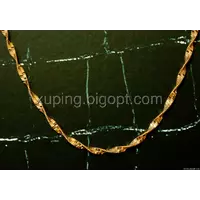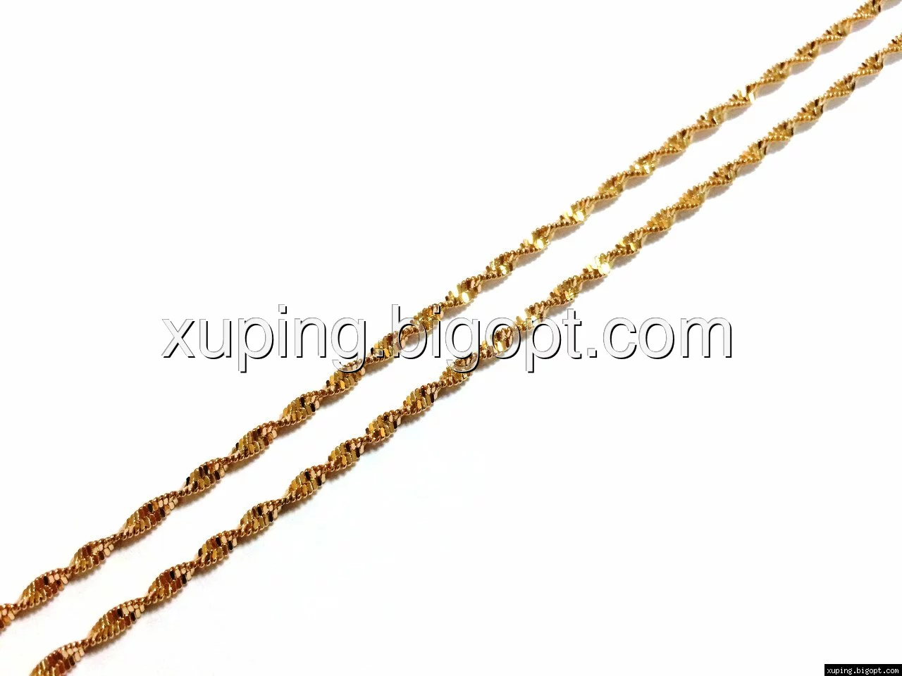 Цепочка выполнена из медицинского сплава на основе латуни с добавлением легирующих елементов, с целью улучшения каких-либо ее свойств, например коррозионной стойкости или прочности. Такой сплав не вызывает аллергии, не вступает в реакцию с потом человека, не меняет свои свойства под воздействием соленой воды и солнца. Поверхность цепочки покрыта золотом 18 карата.