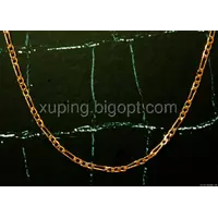 Цепочка выполнена из медицинского сплава на основе латуни с добавлением легирующих елементов, с целью улучшения каких-либо ее свойств, например коррозионной стойкости или прочности. Такой сплав не вызывает аллергии, не вступает в реакцию с потом человека, не меняет свои свойства под воздействием соленой воды и солнца. Поверхность цепочки покрыта золотом 14 карата.