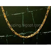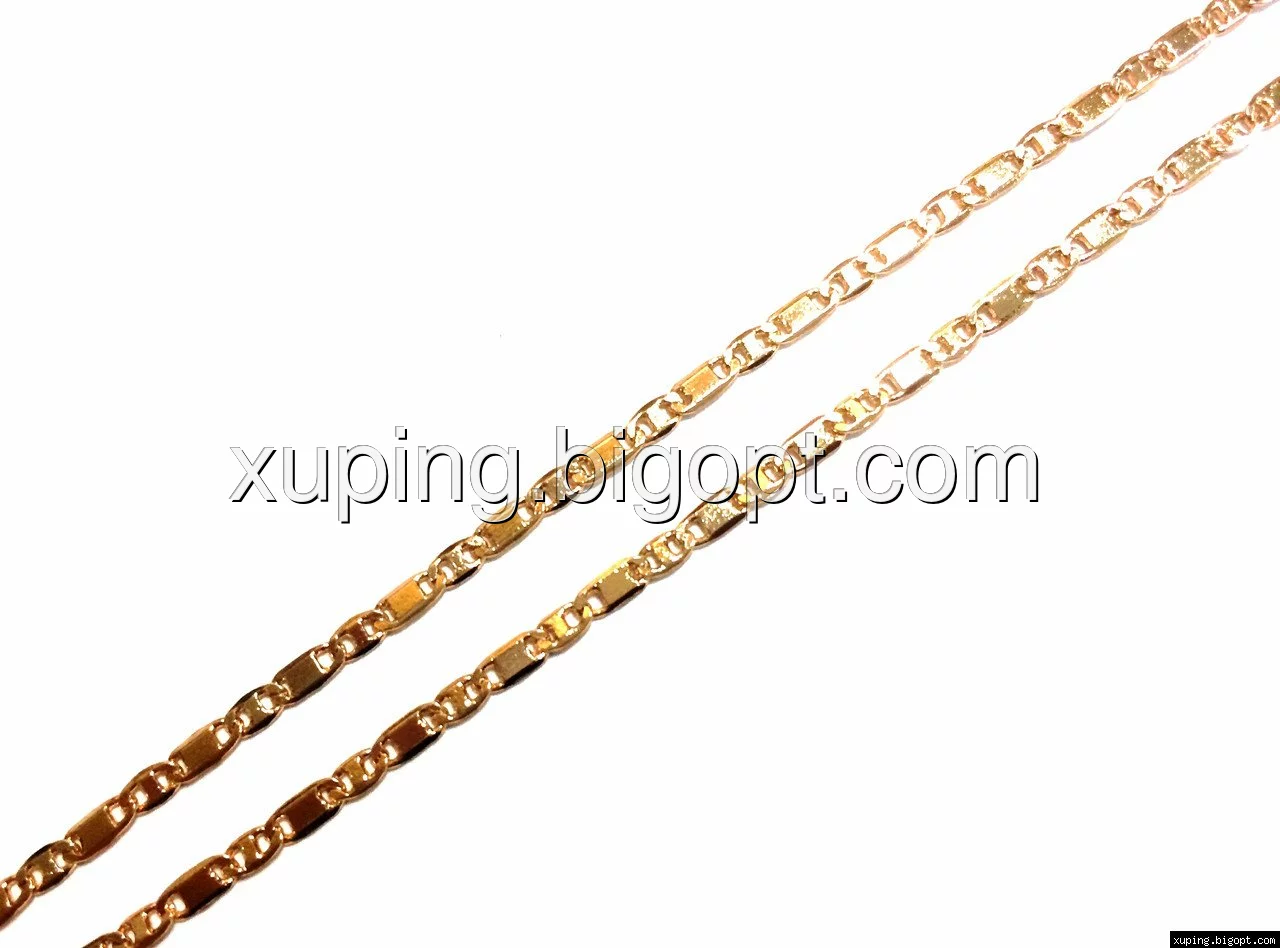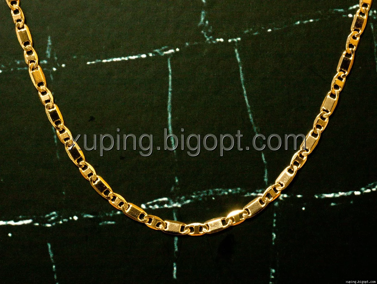 Цепочка выполнена из медицинского сплава на основе латуни с добавлением легирующих елементов, с целью улучшения каких-либо ее свойств, например коррозионной стойкости или прочности. Такой сплав не вызывает аллергии, не вступает в реакцию с потом человека, не меняет свои свойства под воздействием соленой воды и солнца. Поверхность цепочки покрыта золотом 18 карата.