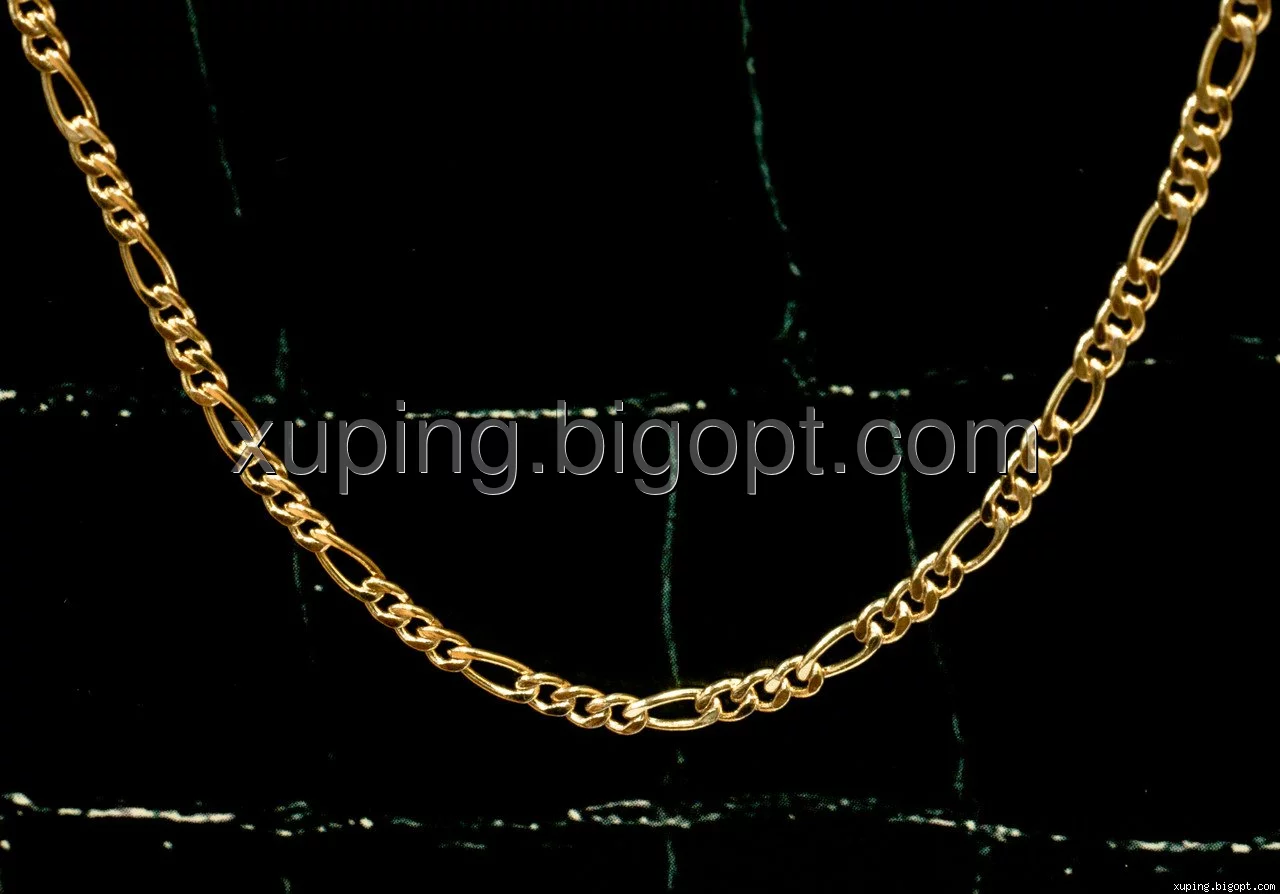 Цепочка выполнена из медицинского сплава на основе латуни с добавлением легирующих елементов, с целью улучшения каких-либо ее свойств, например коррозионной стойкости или прочности. Такой сплав не вызывает аллергии, не вступает в реакцию с потом человека, не меняет свои свойства под воздействием соленой воды и солнца. Поверхность цепочки покрыта золотом 12 карата.