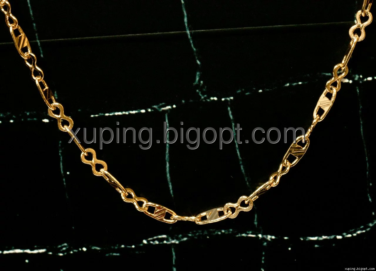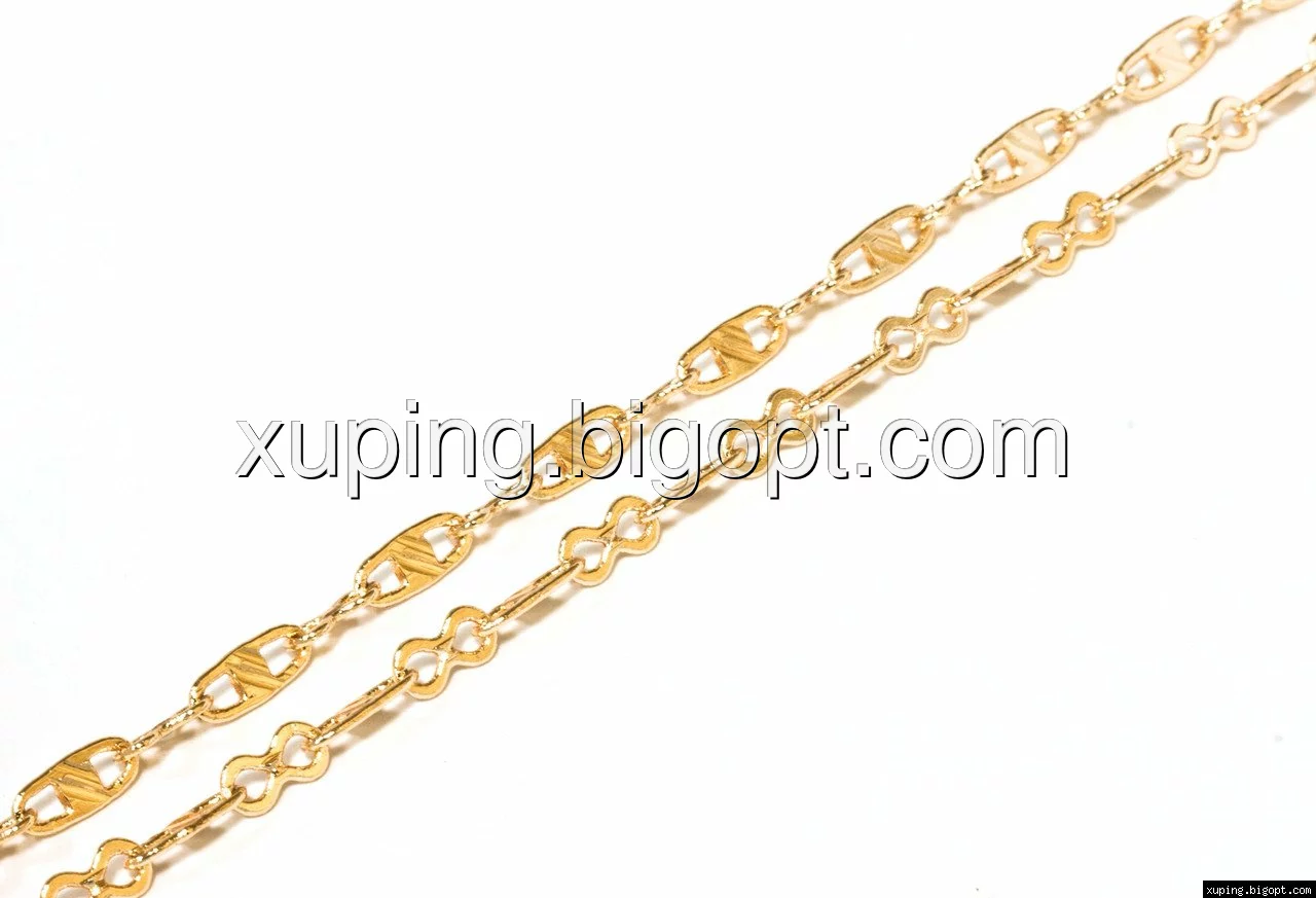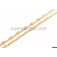 Цепочка выполнена из медицинского сплава на основе латуни с добавлением легирующих елементов, с целью улучшения каких-либо ее свойств, например коррозионной стойкости или прочности. Такой сплав не вызывает аллергии, не вступает в реакцию с потом человека, не меняет свои свойства под воздействием соленой воды и солнца. Поверхность цепочки покрыта золотом 18 карата.