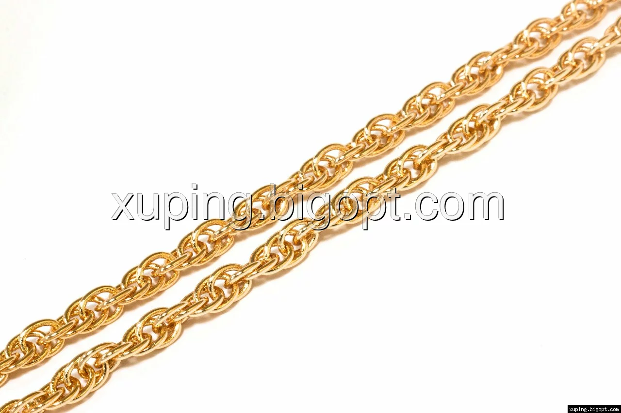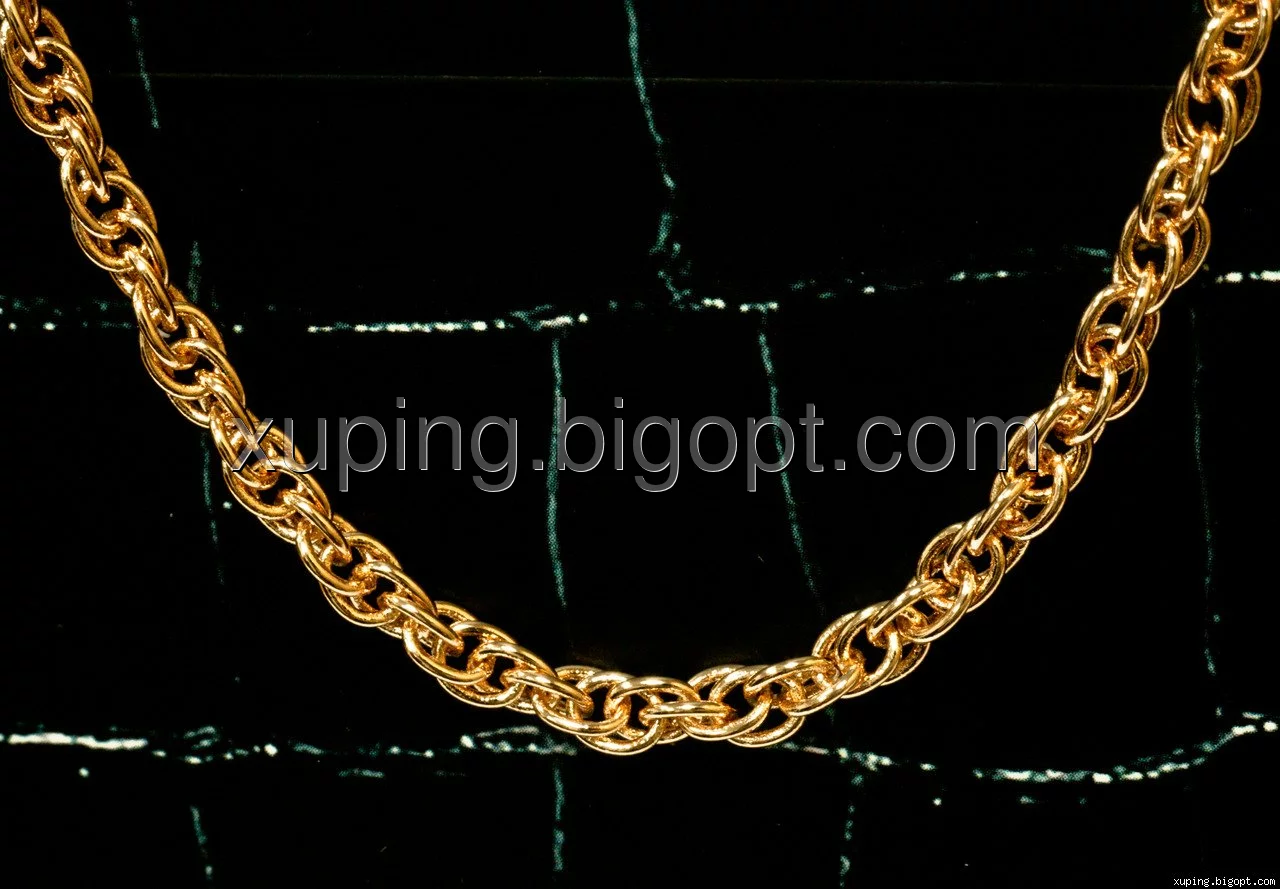 Цепочка выполнена из медицинского сплава на основе латуни с добавлением легирующих елементов, с целью улучшения каких-либо ее свойств, например коррозионной стойкости или прочности. Такой сплав не вызывает аллергии, не вступает в реакцию с потом человека, не меняет свои свойства под воздействием соленой воды и солнца. Поверхность цепочки покрыта золотом 18 карата.