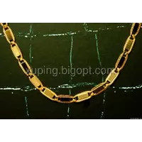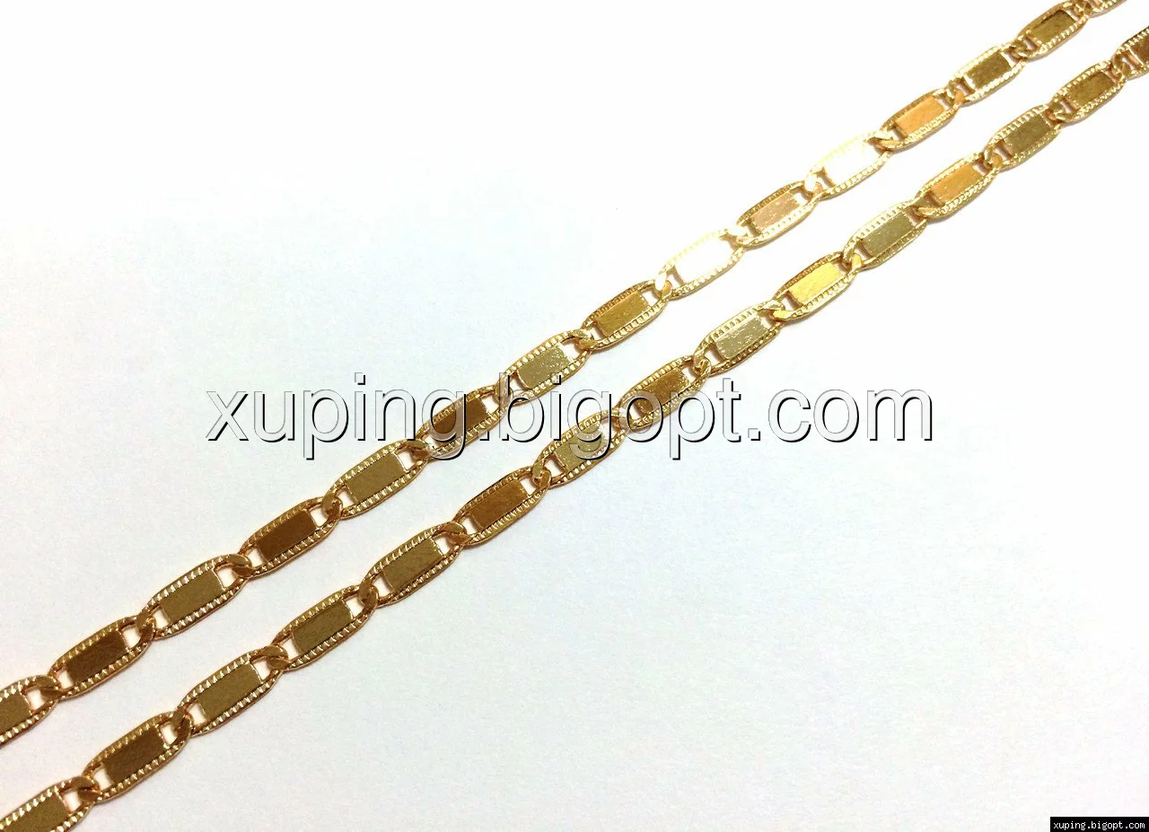 Цепочка выполнена из медицинского сплава на основе латуни с добавлением легирующих елементов, с целью улучшения каких-либо ее свойств, например коррозионной стойкости или прочности. Такой сплав не вызывает аллергии, не вступает в реакцию с потом человека, не меняет свои свойства под воздействием соленой воды и солнца. Поверхность цепочки покрыта золотом 18 карата.