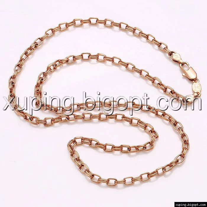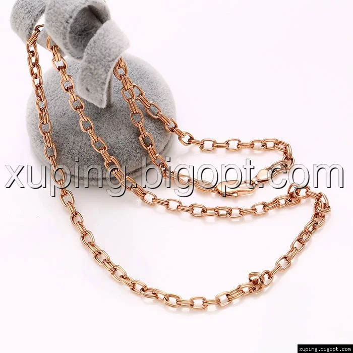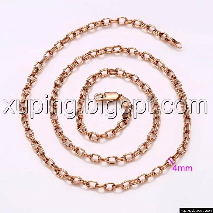 Цепочка выполнена из медицинского сплава на основе латуни с добавлением легирующих елементов, с целью улучшения каких-либо ее свойств, например коррозионной стойкости или прочности. Такой сплав не вызывает аллергии, не вступает в реакцию с потом человека, не меняет свои свойства под воздействием соленой воды и солнца. Поверхность цепочки покрыта золотом 24 карата.