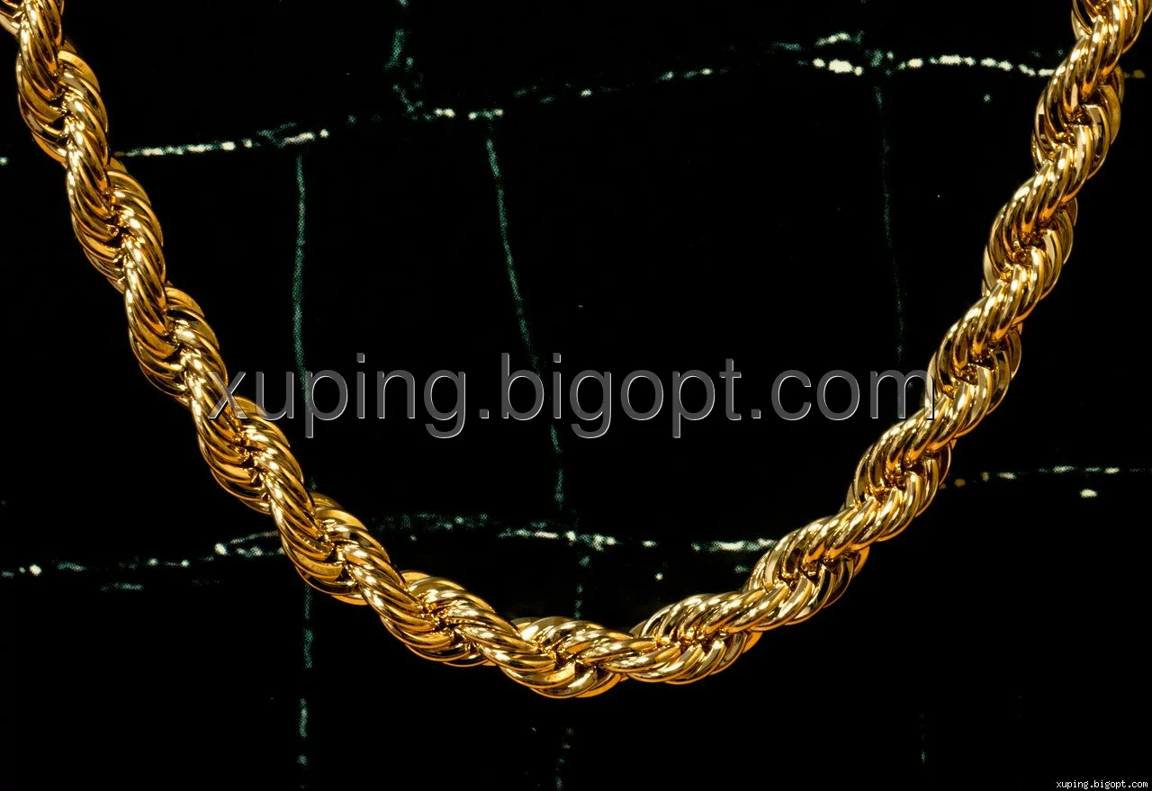Цепочка выполнена из медицинского сплава на основе латуни с добавлением легирующих елементов, с целью улучшения каких-либо ее свойств, например коррозионной стойкости или прочности. Такой сплав не вызывает аллергии, не вступает в реакцию с потом человека, не меняет свои свойства под воздействием соленой воды и солнца. Поверхность цепочки покрыта золотом 18 карата.