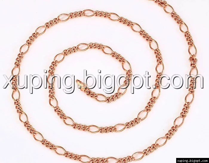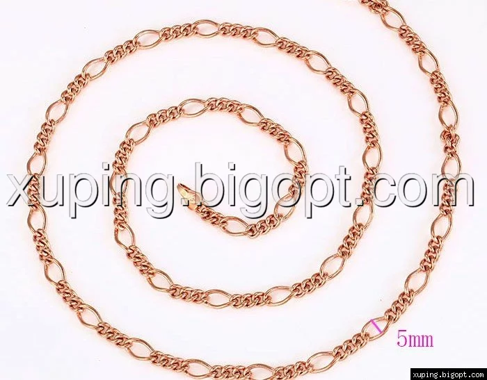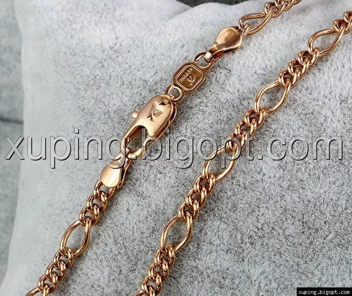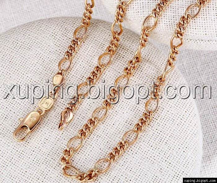 Цепочка выполнена из медицинского сплава на основе латуни с добавлением легирующих елементов, с целью улучшения каких-либо ее свойств, например коррозионной стойкости или прочности. Такой сплав не вызывает аллергии, не вступает в реакцию с потом человека, не меняет свои свойства под воздействием соленой воды и солнца. Поверхность цепочки покрыта золотом 24 карата.