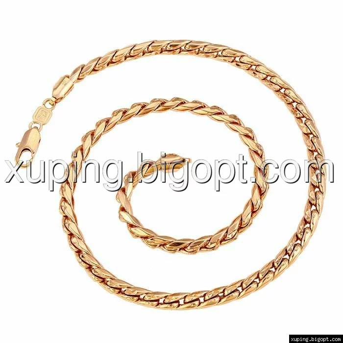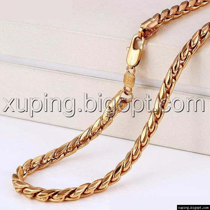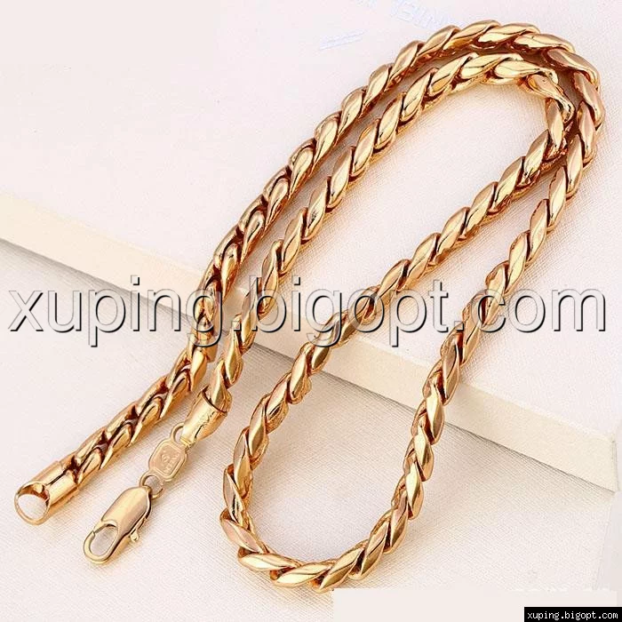 Цепочка выполнена из медицинского сплава на основе латуни с добавлением легирующих елементов, с целью улучшения каких-либо ее свойств, например коррозионной стойкости или прочности. Такой сплав не вызывает аллергии, не вступает в реакцию с потом человека, не меняет свои свойства под воздействием соленой воды и солнца. Поверхность цепочки покрыта золотом 14 карата.