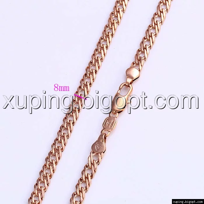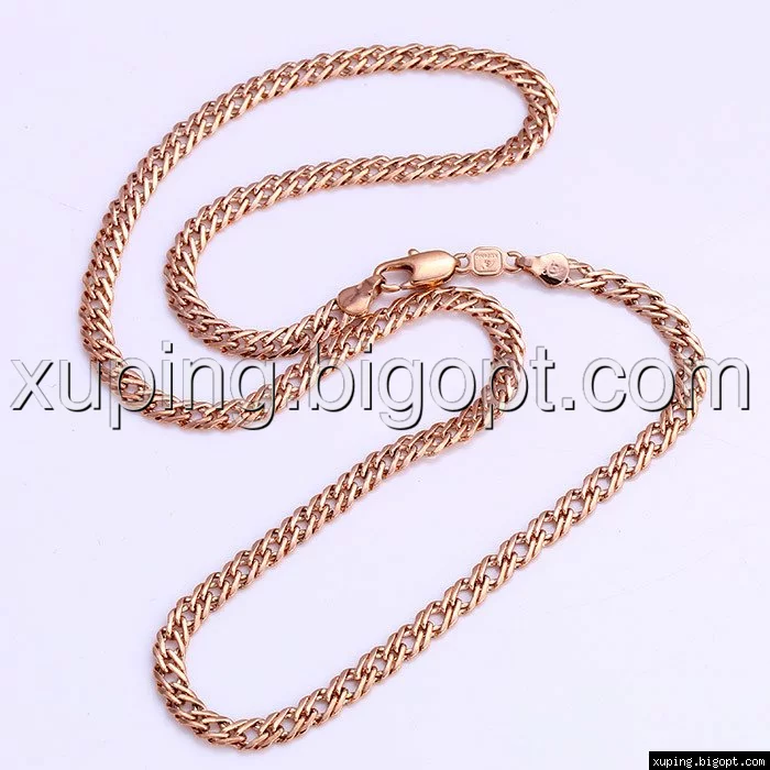Цепочка выполнена из медицинского сплава на основе латуни с добавлением легирующих елементов, с целью улучшения каких-либо ее свойств, например коррозионной стойкости или прочности. Такой сплав не вызывает аллергии, не вступает в реакцию с потом человека, не меняет свои свойства под воздействием соленой воды и солнца. Поверхность цепочки покрыта золотом 14 карата.