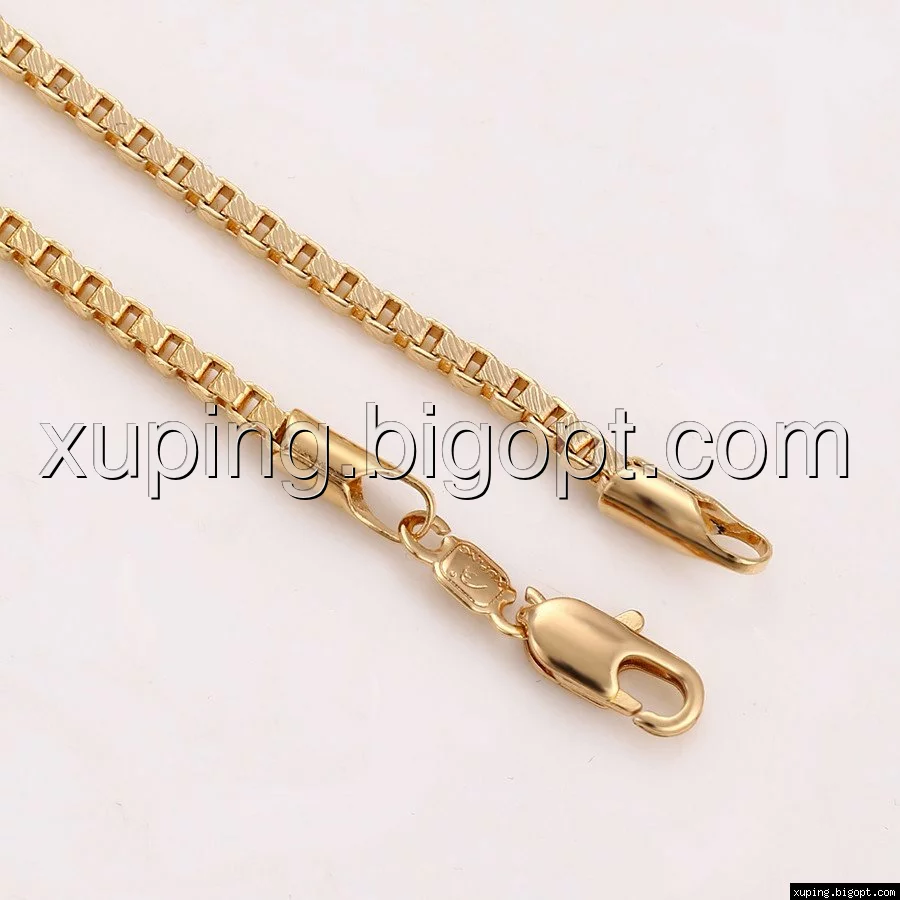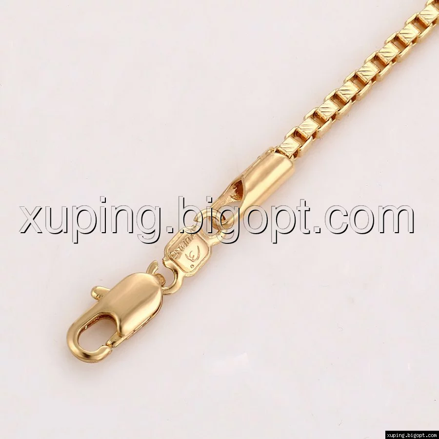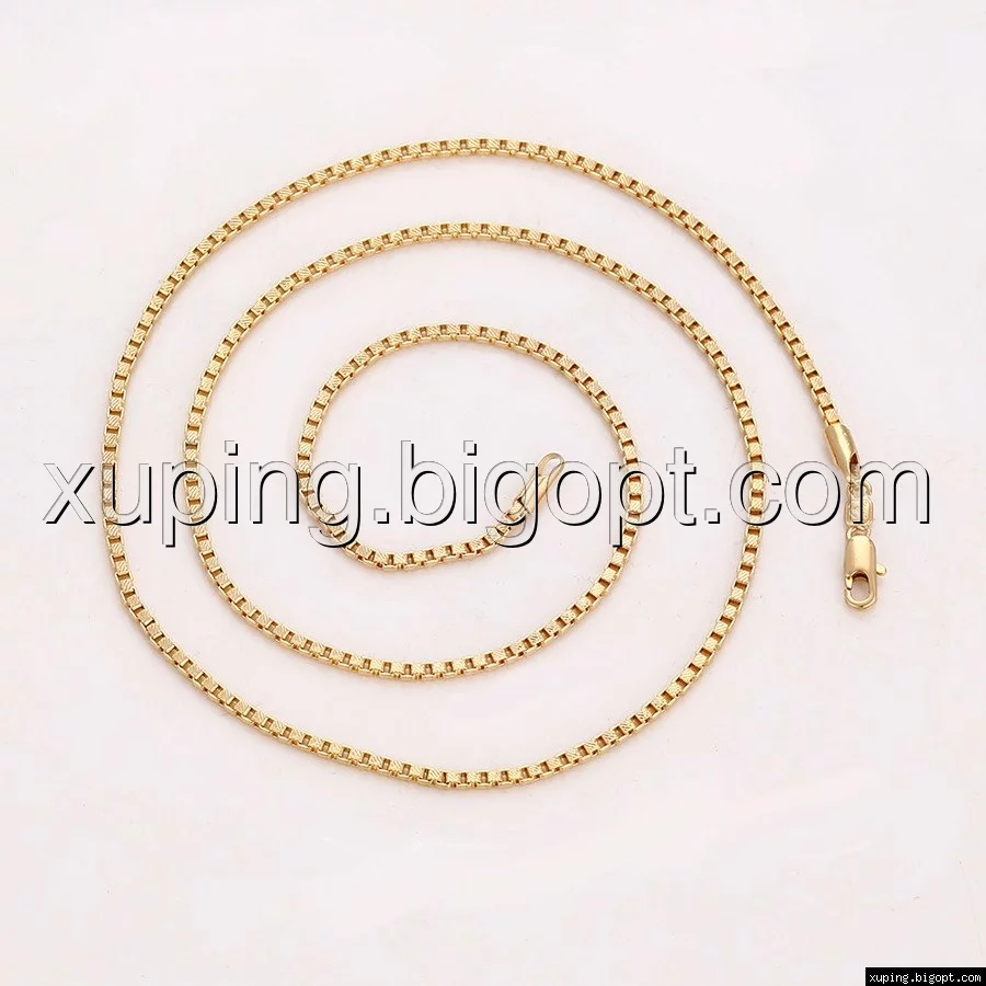 Цепочка выполнена из медицинского сплава на основе латуни с добавлением легирующих элементов, с целью улучшения каких-либо ее свойств, например коррозионной стойкости или прочности. Такой сплав не вызывает аллергии, не вступает в реакцию с потом человека, не меняет свои свойства под воздействием соленой воды и солнца. Поверхность цепочки покрыта золотом 18 карата.
