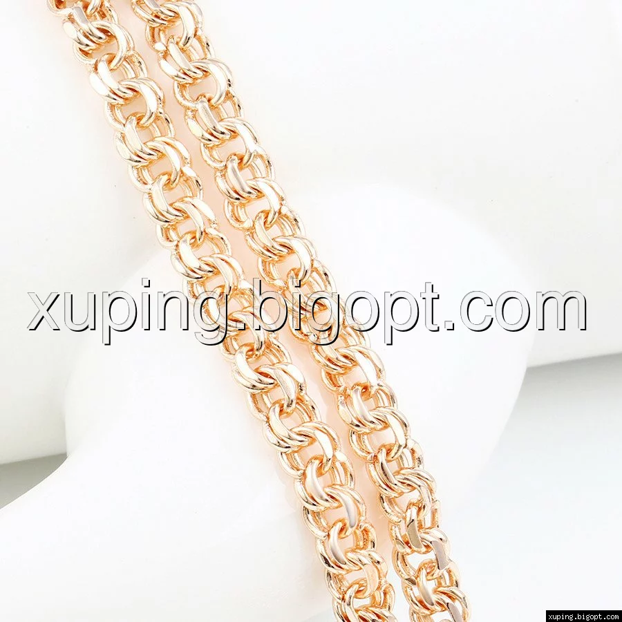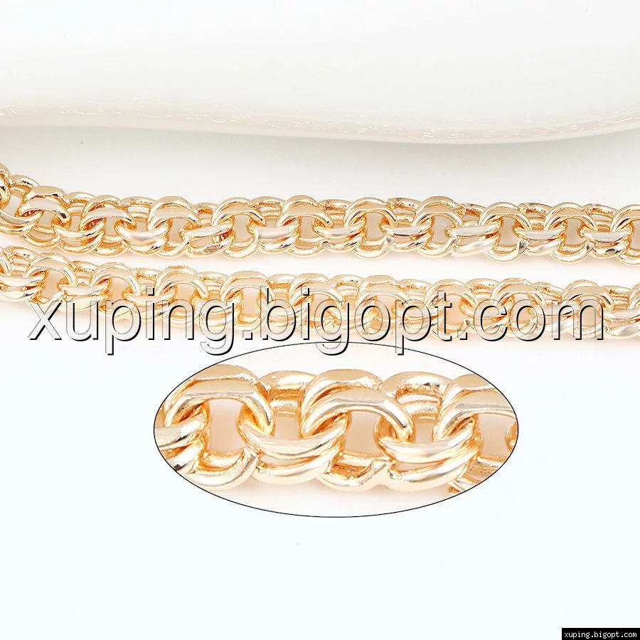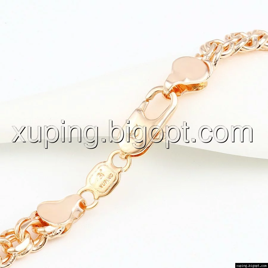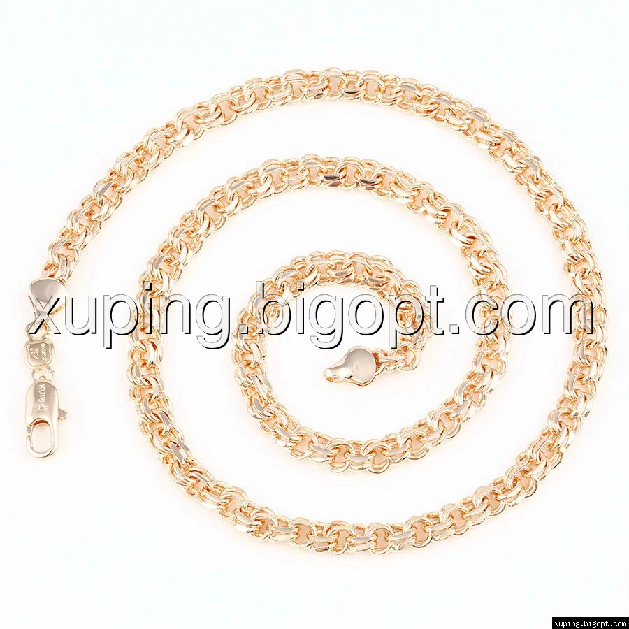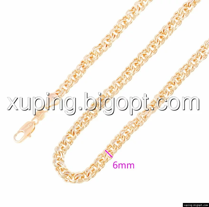 Цепочка выполнена из медицинского сплава на основе латуни с добавлением легирующих элементов, с целью улучшения каких-либо ее свойств, например коррозионной стойкости или прочности. Такой сплав не вызывает аллергии, не вступает в реакцию с потом человека, не меняет свои свойства под воздействием соленой воды и солнца. Поверхность цепочки покрыта золотом 14 карата.