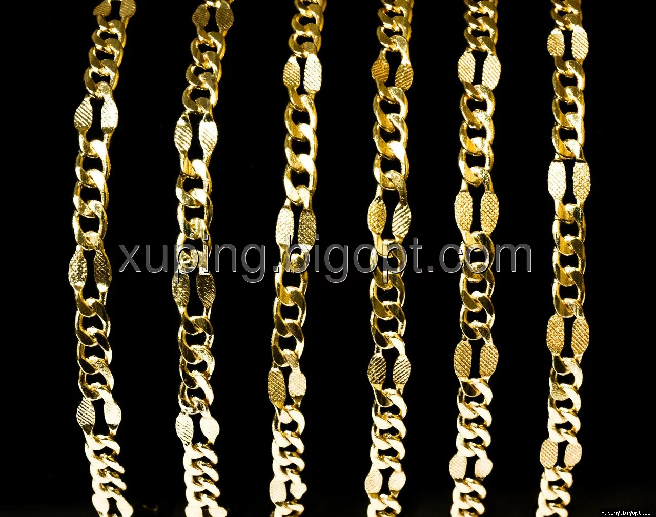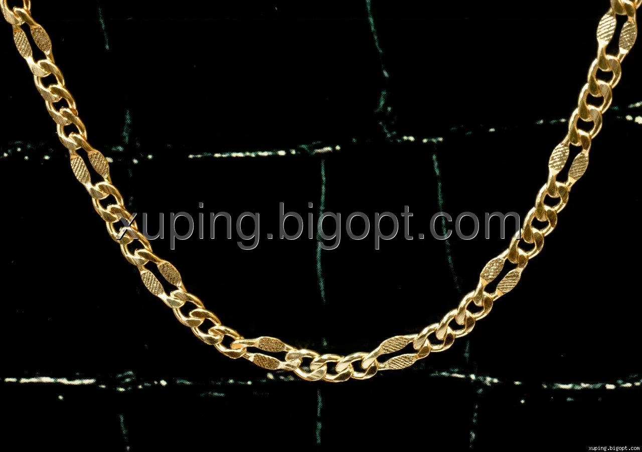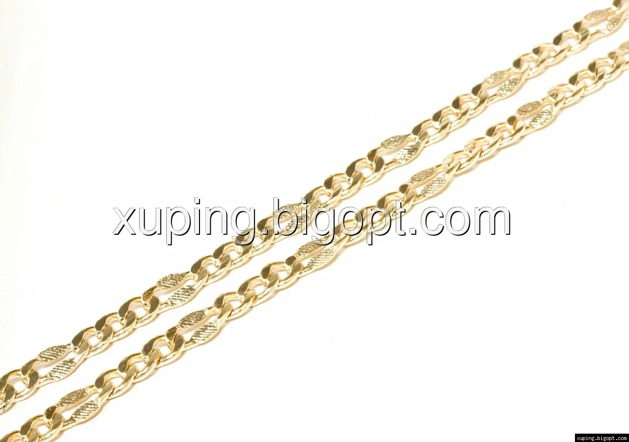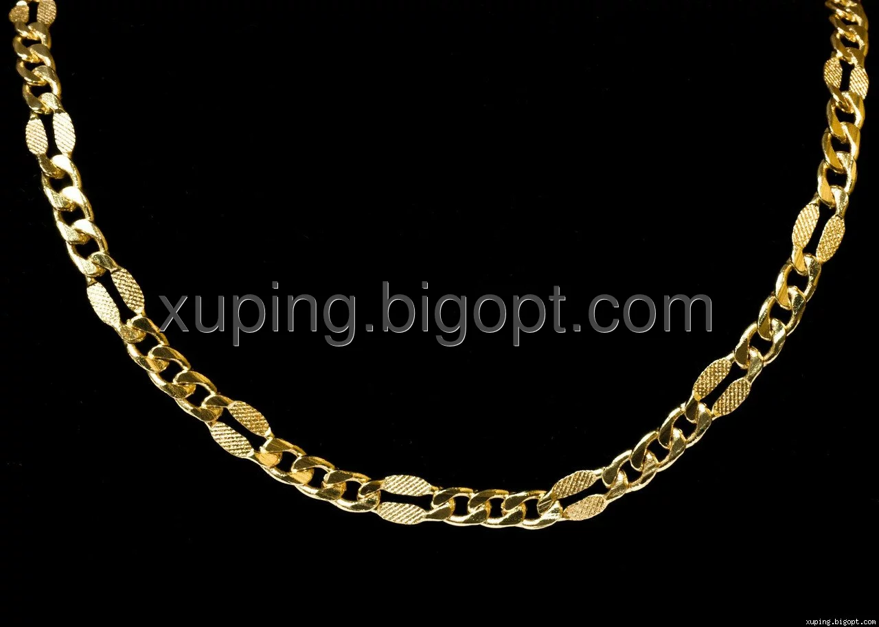 Цепочка выполнена из медицинского сплава на основе латуни с добавлением легирующих елементов, с целью улучшения каких-либо ее свойств, например коррозионной стойкости или прочности. Такой сплав не вызывает аллергии, не вступает в реакцию с потом человека, не меняет свои свойства под воздействием соленой воды и солнца. Поверхность цепочки покрыта золотом 12 карата.