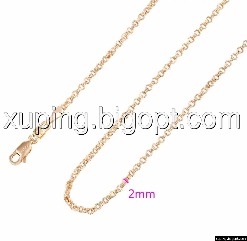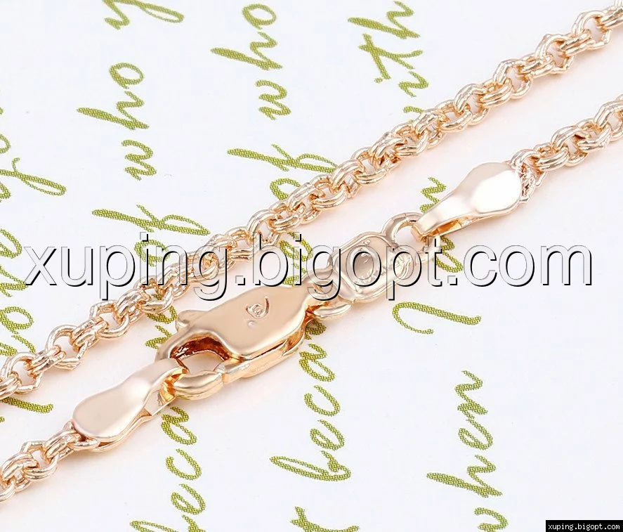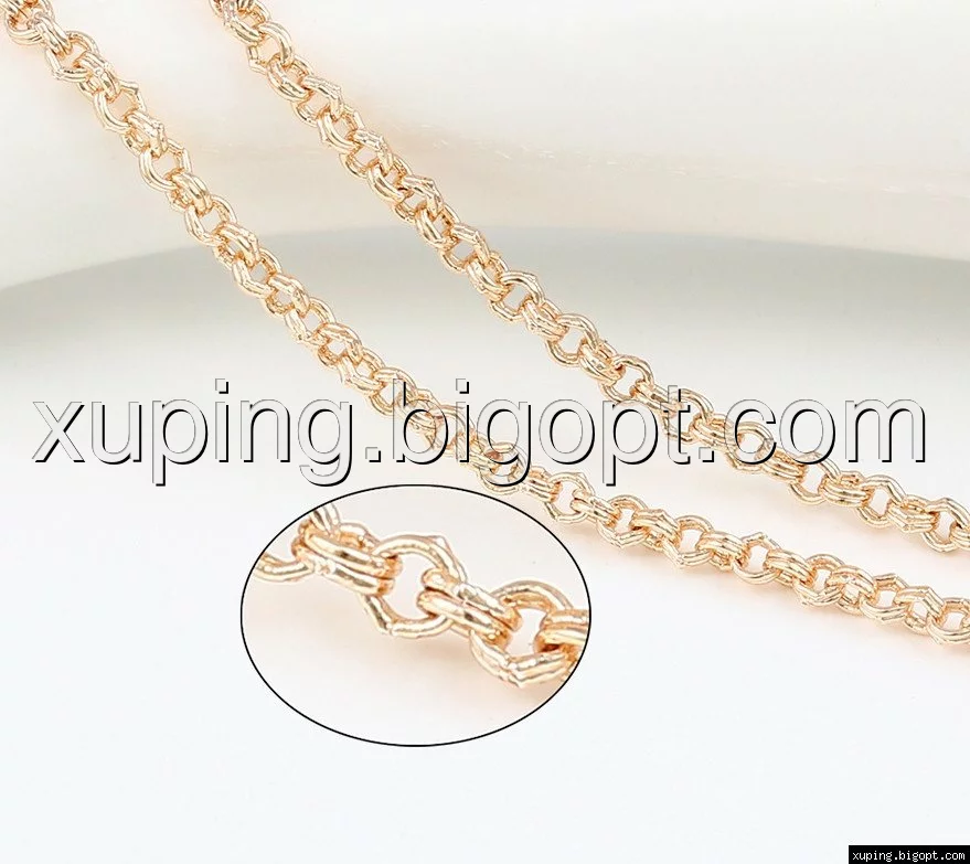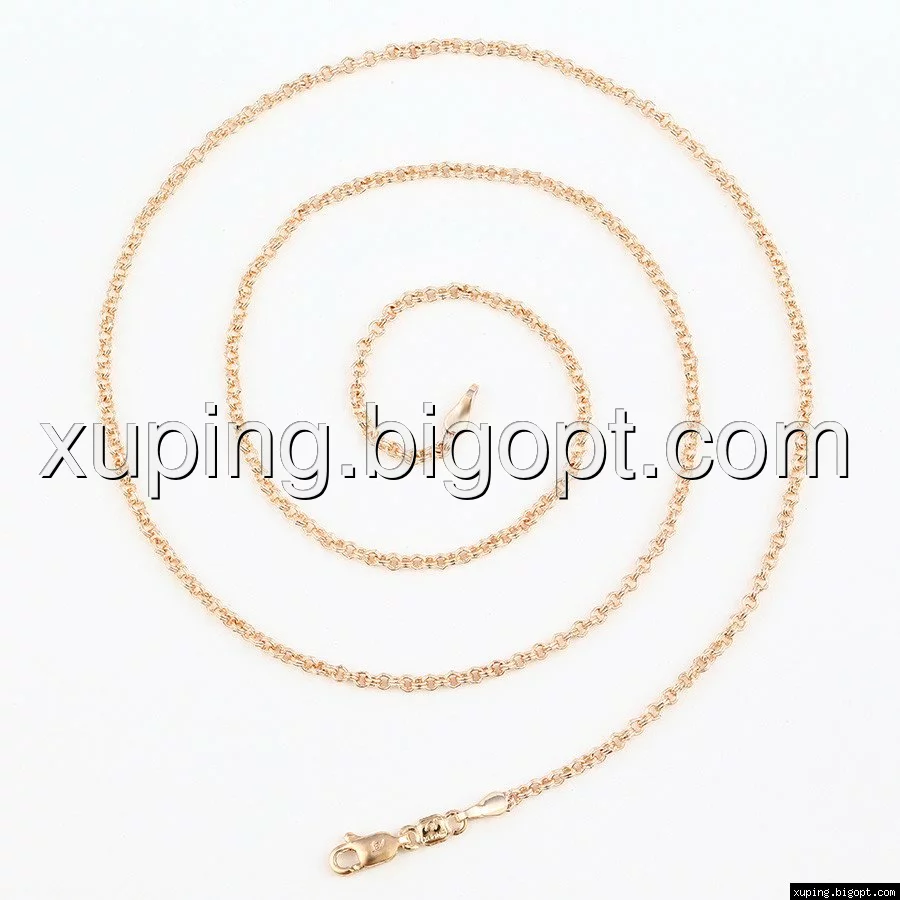 Цепочка выполнена из медицинского сплава на основе латуни с добавлением легирующих элементов, с целью улучшения каких-либо ее свойств, например коррозионной стойкости или прочности. Такой сплав не вызывает аллергии, не вступает в реакцию с потом человека, не меняет свои свойства под воздействием соленой воды и солнца. Поверхность цепочки покрыта золотом 14 карата.