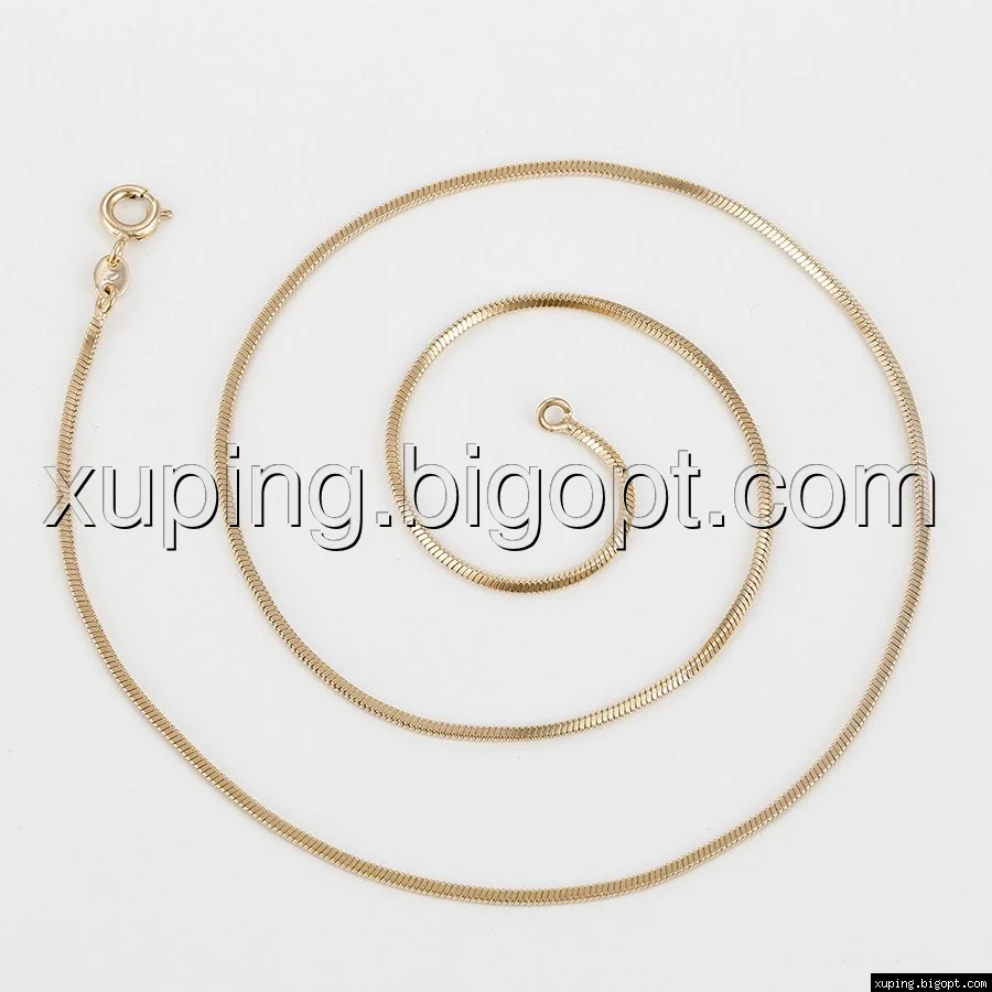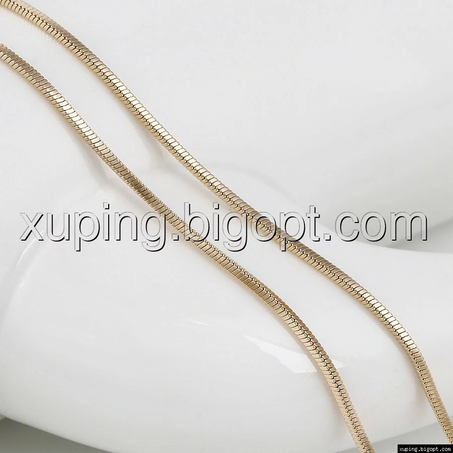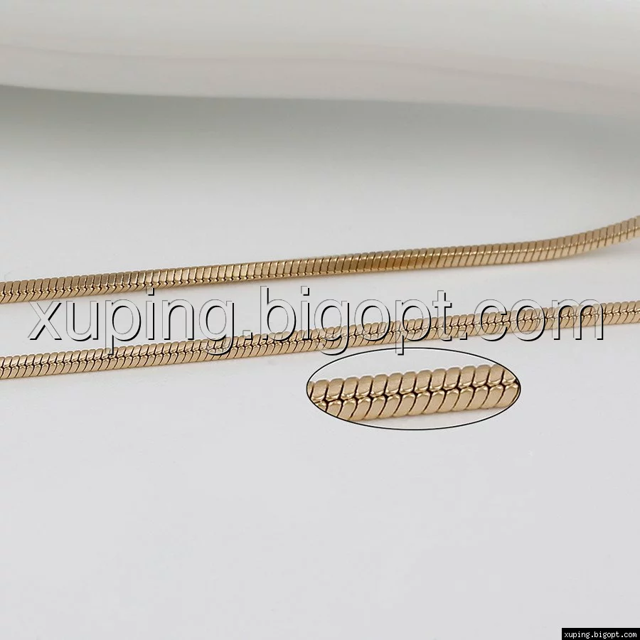 Цепочка выполнена из медицинского сплава на основе латуни с добавлением легирующих элементов, с целью улучшения каких-либо ее свойств, например коррозионной стойкости или прочности. Такой сплав не вызывает аллергии, не вступает в реакцию с потом человека, не меняет свои свойства под воздействием соленой воды и солнца. Поверхность цепочки покрыта золотом 18 карата.