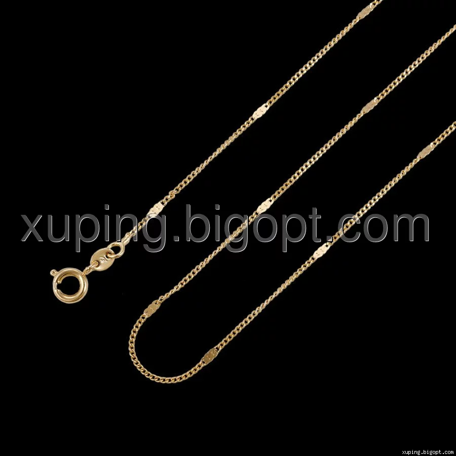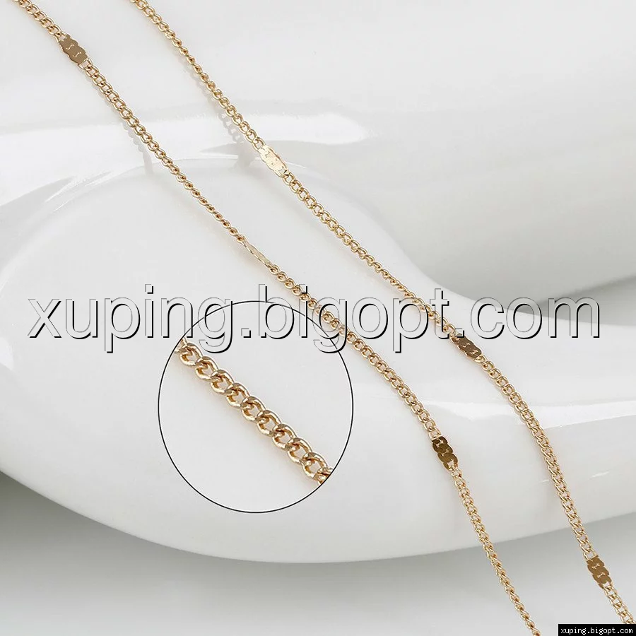 Цепочка выполнена из медицинского сплава на основе латуни с добавлением легирующих элементов, с целью улучшения каких-либо ее свойств, например коррозионной стойкости или прочности. Такой сплав не вызывает аллергии, не вступает в реакцию с потом человека, не меняет свои свойства под воздействием соленой воды и солнца. Поверхность цепочки покрыта золотом 18 карата.