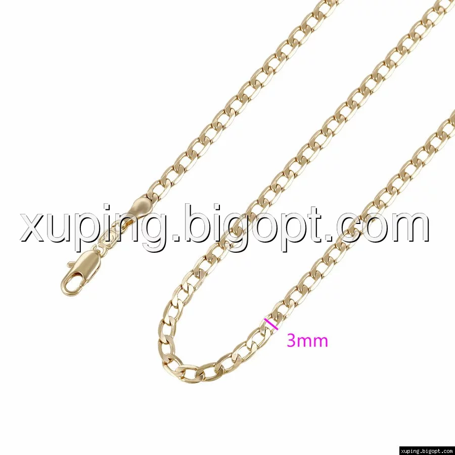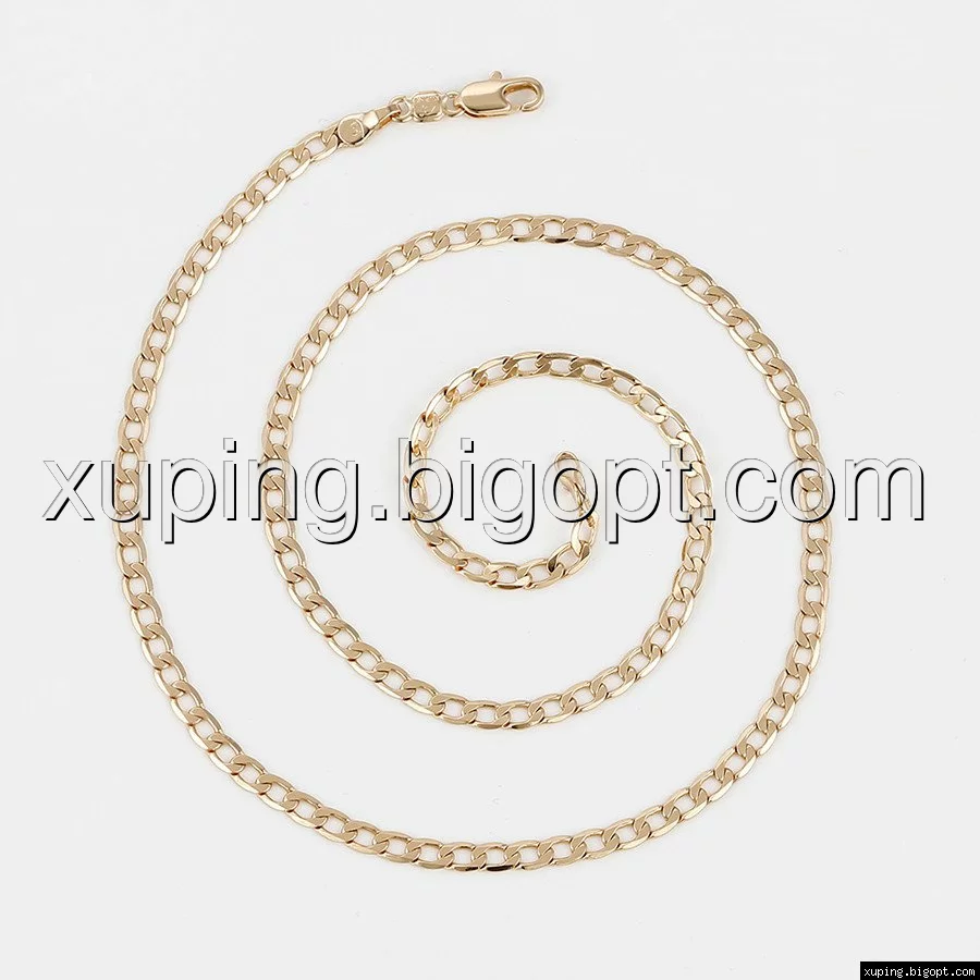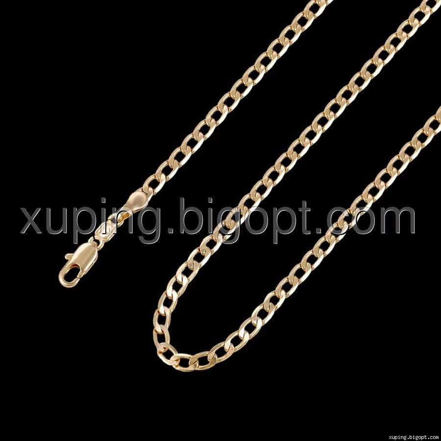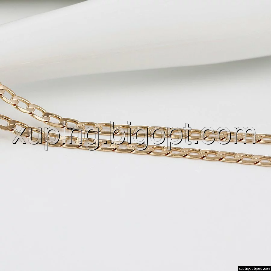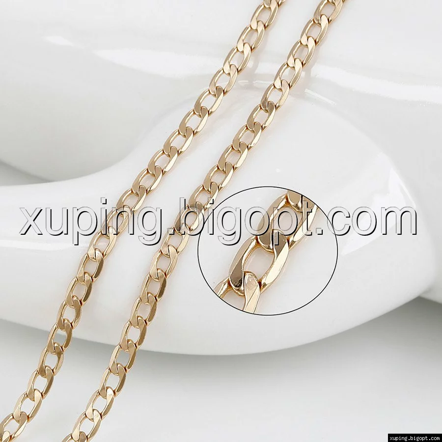 Цепочка выполнена из медицинского сплава на основе латуни с добавлением легирующих элементов, с целью улучшения каких-либо ее свойств, например коррозионной стойкости или прочности. Такой сплав не вызывает аллергии, не вступает в реакцию с потом человека, не меняет свои свойства под воздействием соленой воды и солнца. Поверхность цепочки покрыта золотом 18 карата.