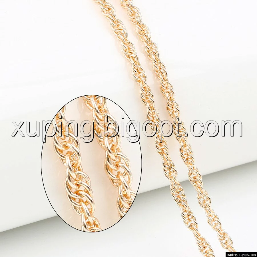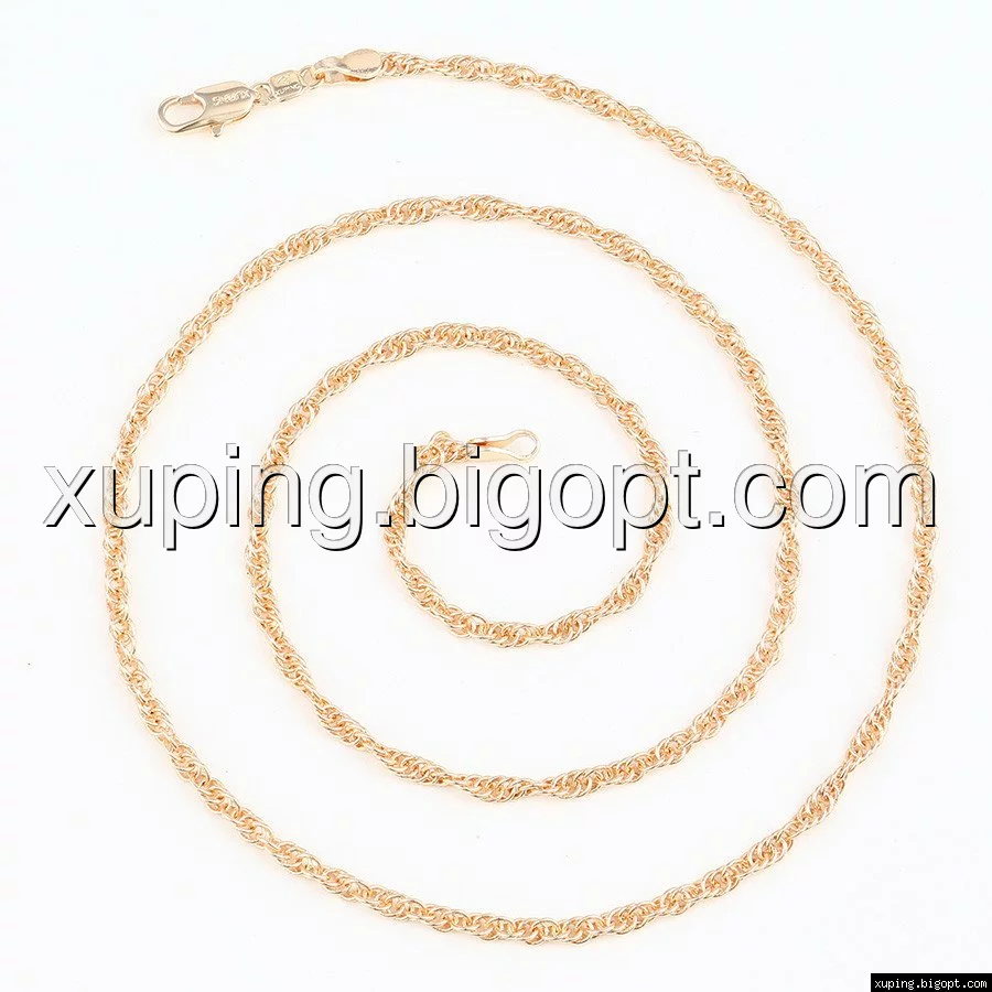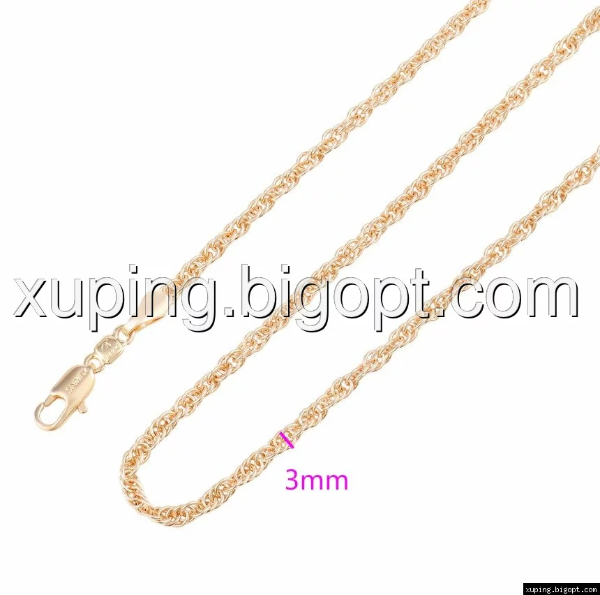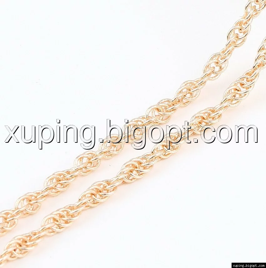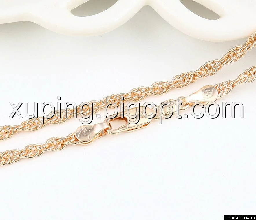 Цепочка выполнена из медицинского сплава на основе латуни с добавлением легирующих элементов, с целью улучшения каких-либо ее свойств, например коррозионной стойкости или прочности. Такой сплав не вызывает аллергии, не вступает в реакцию с потом человека, не меняет свои свойства под воздействием соленой воды и солнца. Поверхность цепочки покрыта золотом 18 карата.