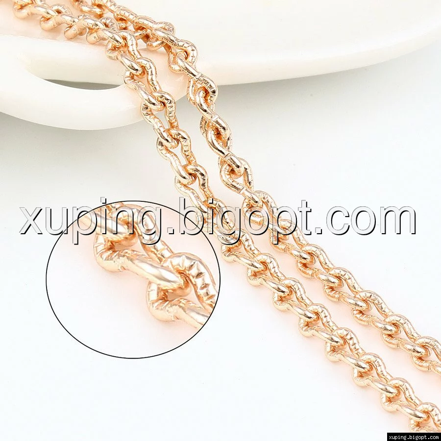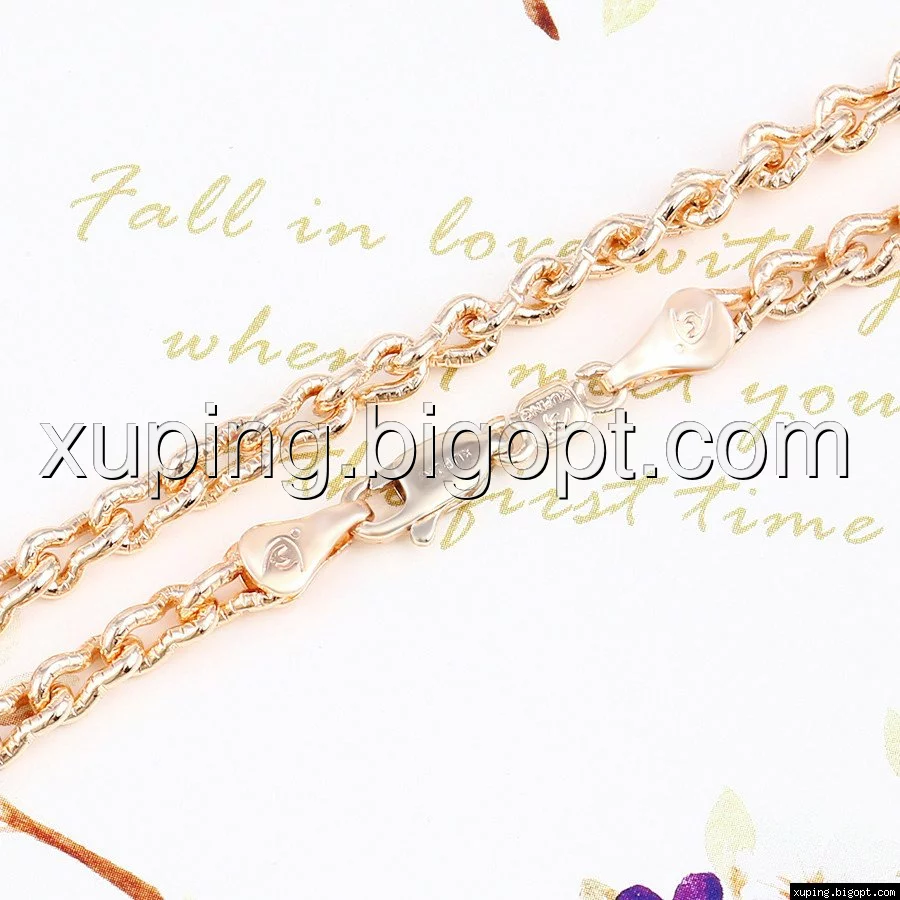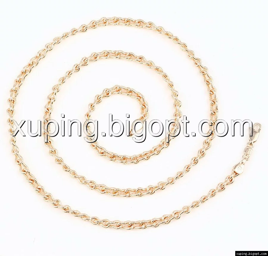 Цепочка выполнена из медицинского сплава на основе латуни с добавлением легирующих элементов, с целью улучшения каких-либо ее свойств, например коррозионной стойкости или прочности. Такой сплав не вызывает аллергии, не вступает в реакцию с потом человека, не меняет свои свойства под воздействием соленой воды и солнца. Поверхность цепочки покрыта золотом 14 карата.