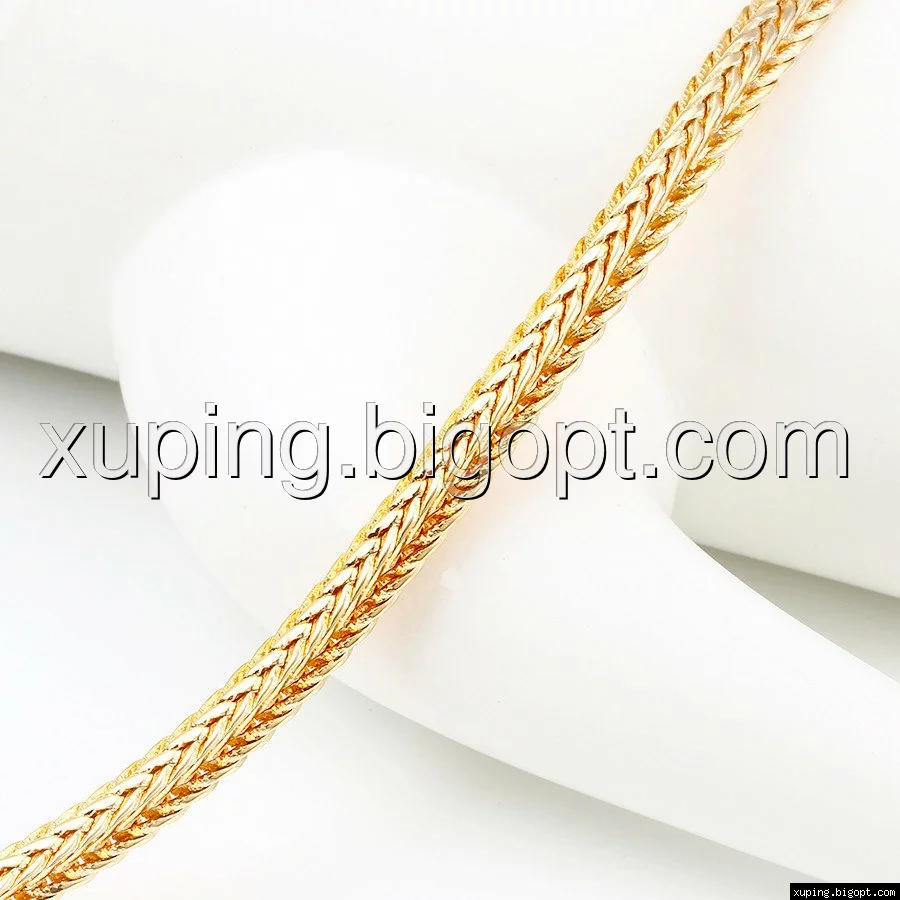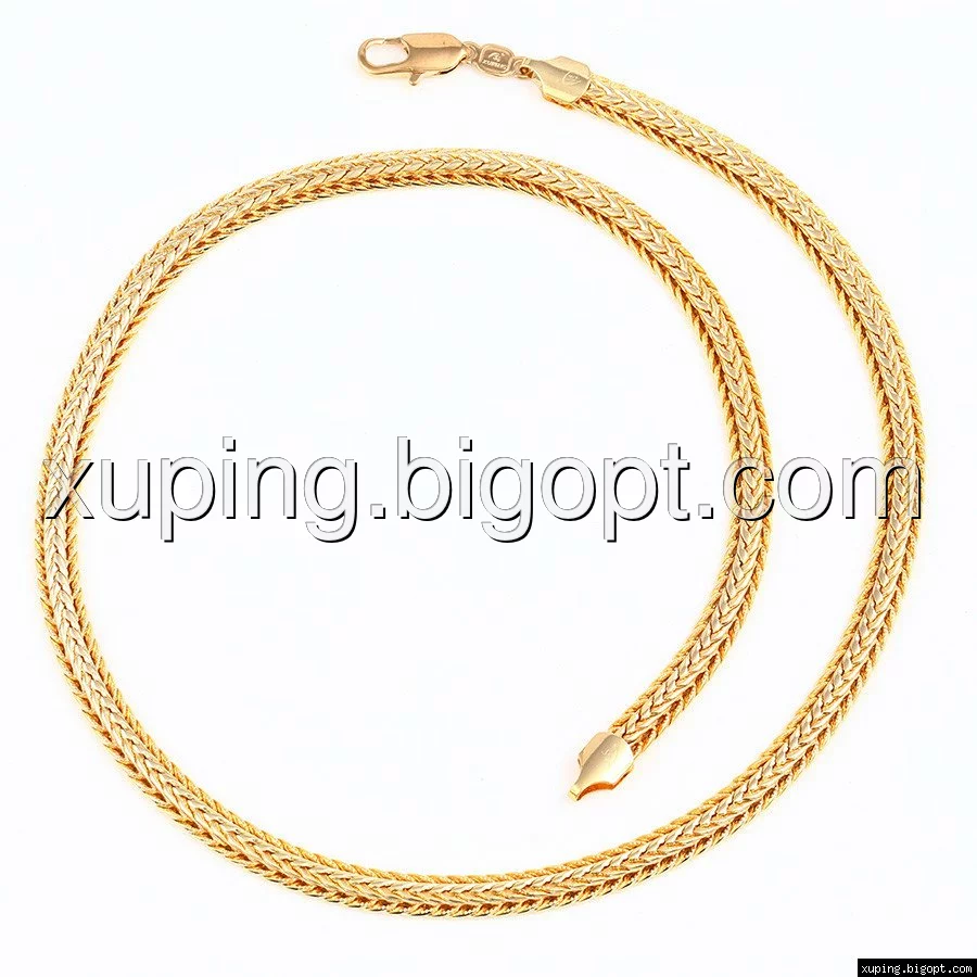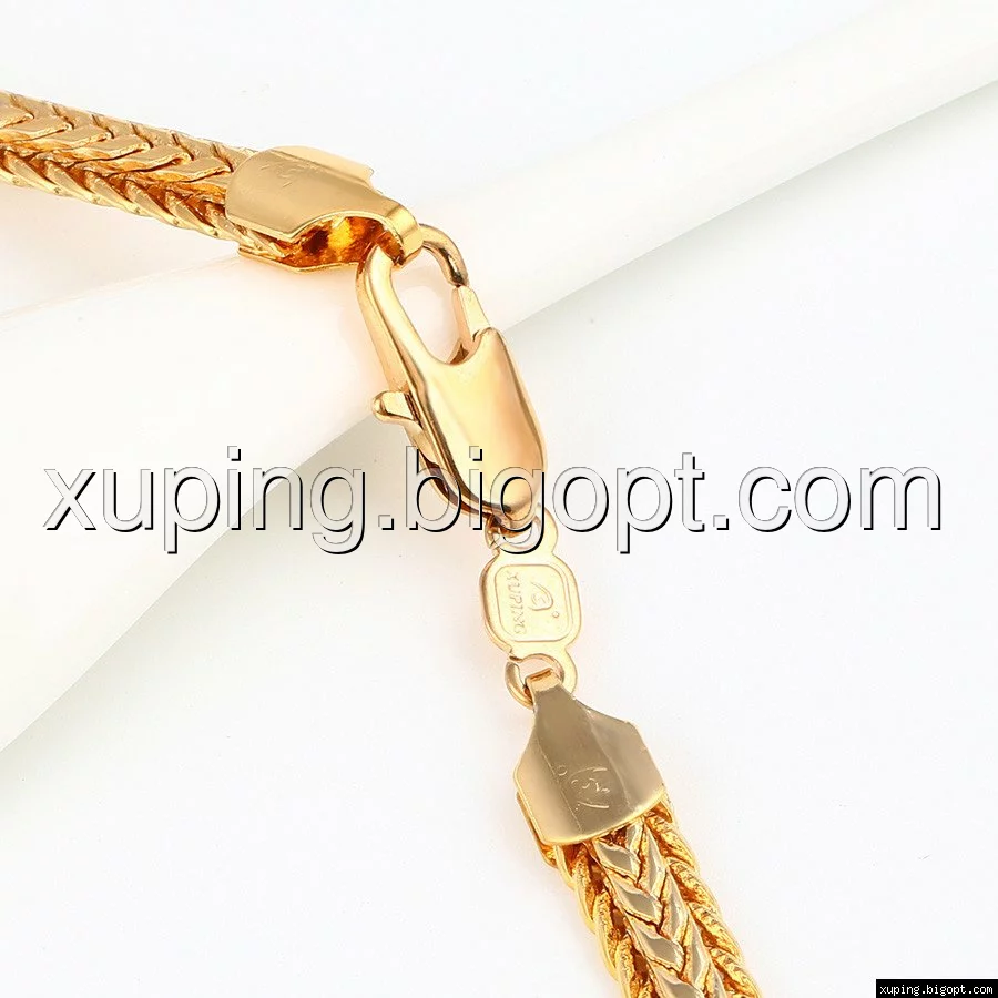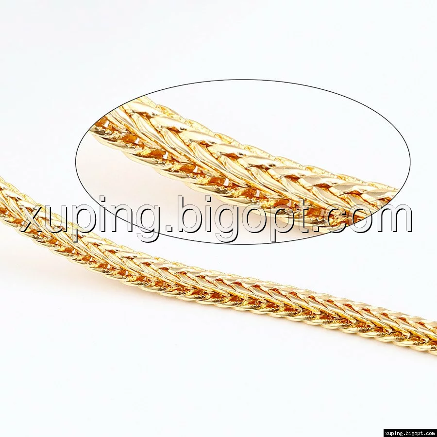 Цепочка выполнена из медицинского сплава на основе латуни с добавлением легирующих элементов, с целью улучшения каких-либо ее свойств, например коррозионной стойкости или прочности. Такой сплав не вызывает аллергии, не вступает в реакцию с потом человека, не меняет свои свойства под воздействием соленой воды и солнца. Поверхность цепочки покрыта золотом 14 карата.
