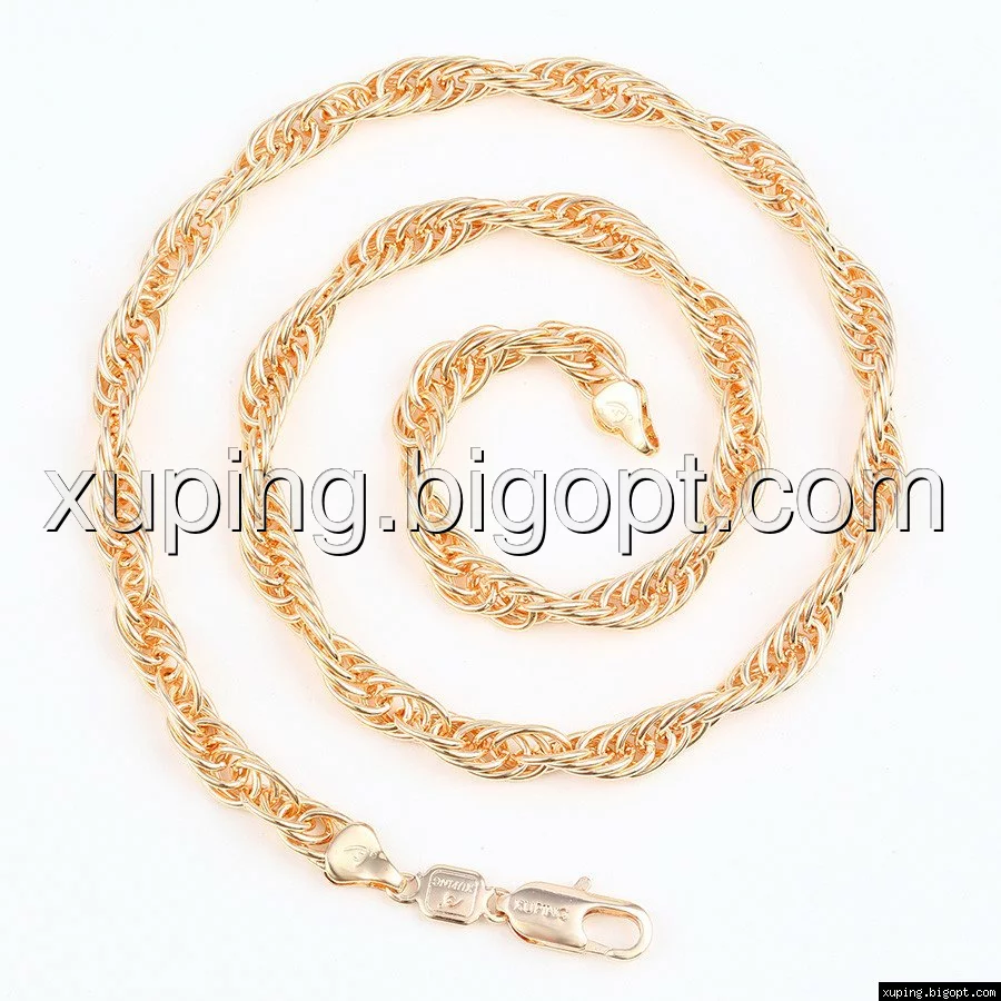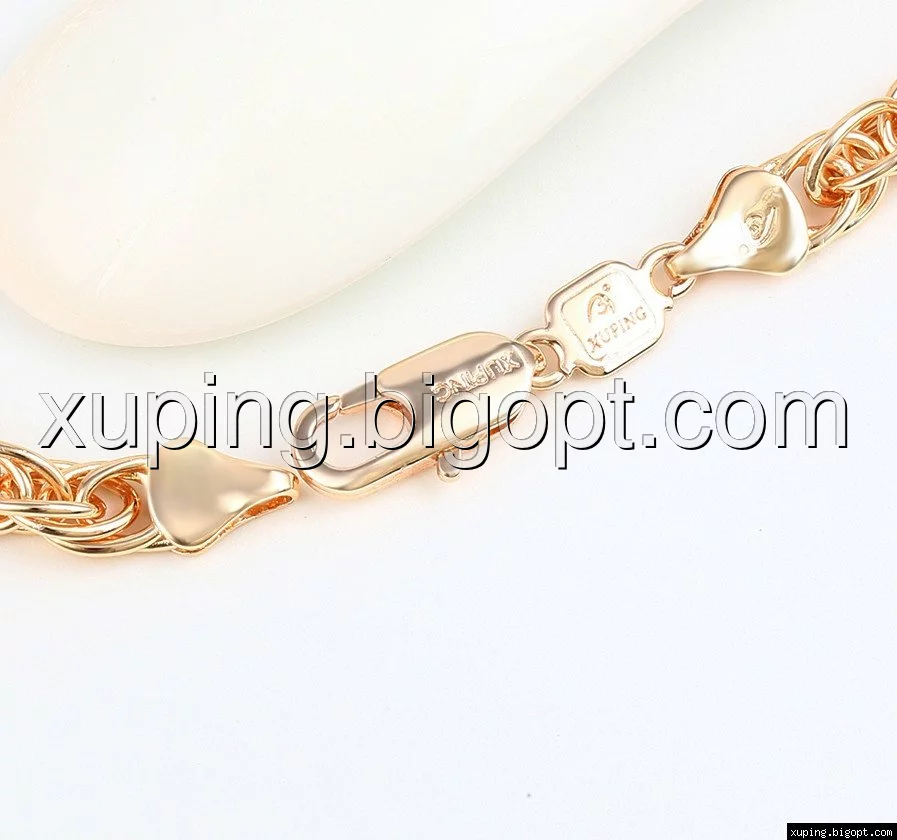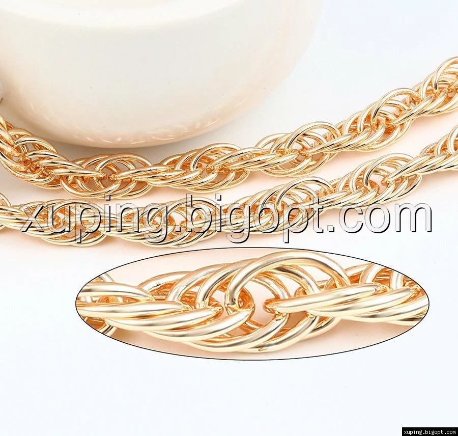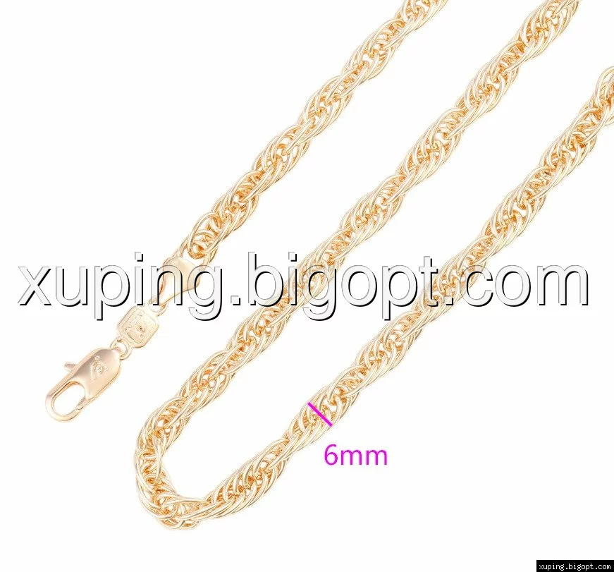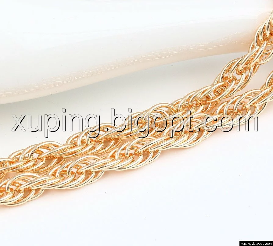 Цепочка выполнена из медицинского сплава на основе латуни с добавлением легирующих элементов, с целью улучшения каких-либо ее свойств, например коррозионной стойкости или прочности. Такой сплав не вызывает аллергии, не вступает в реакцию с потом человека, не меняет свои свойства под воздействием соленой воды и солнца. Поверхность цепочки покрыта золотом 14 карата.