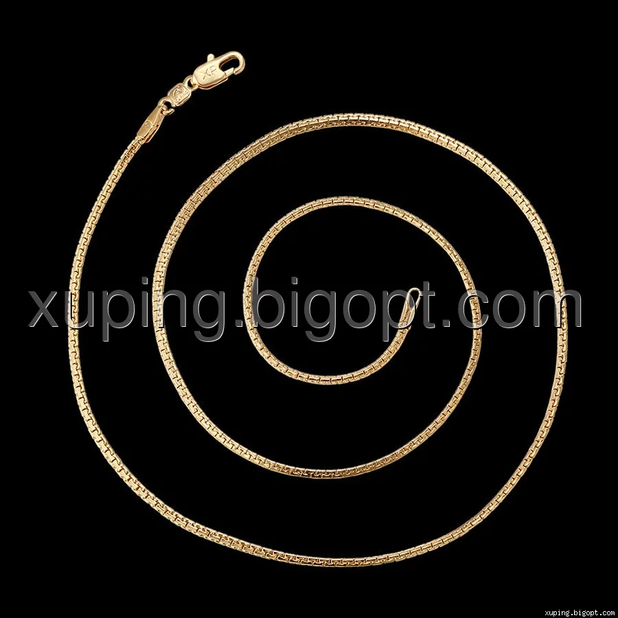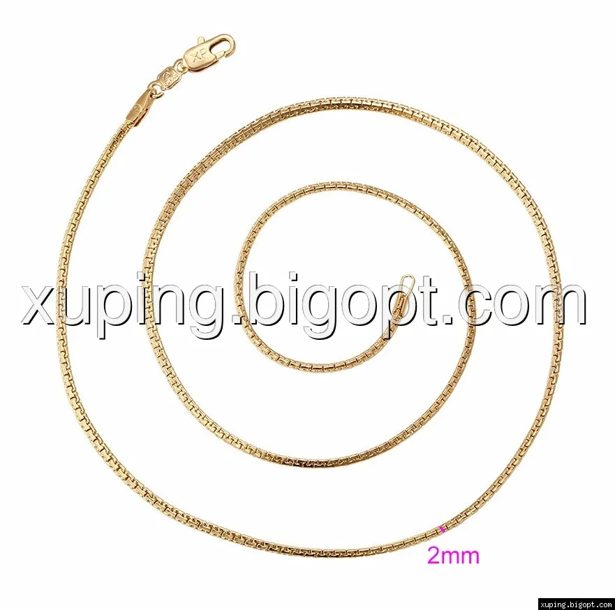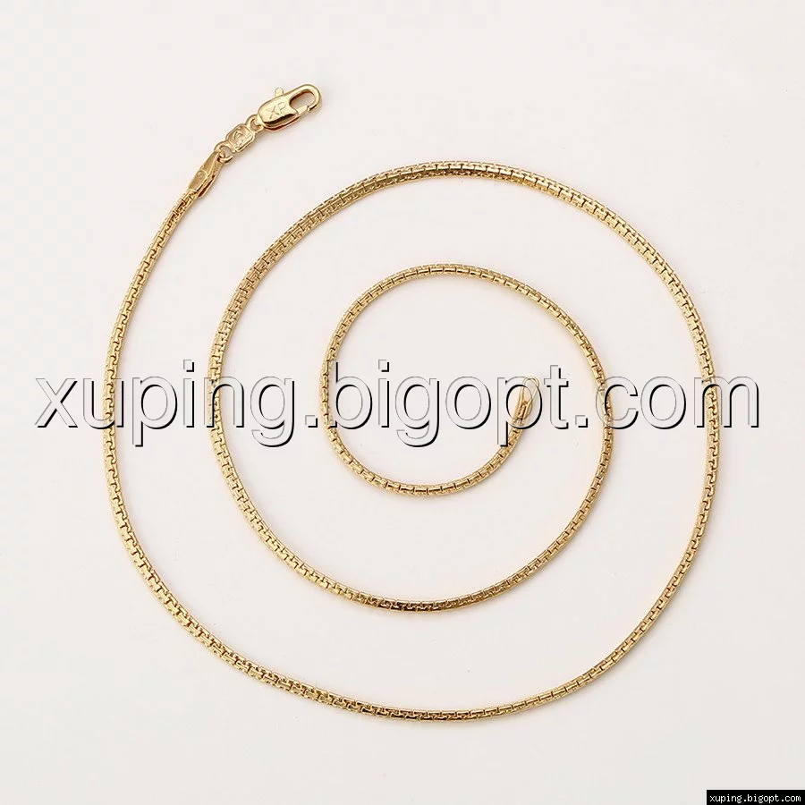Цепочка выполнена из медицинского сплава на основе латуни с добавлением легирующих элементов, с целью улучшения каких-либо ее свойств, например коррозионной стойкости или прочности. Такой сплав не вызывает аллергии, не вступает в реакцию с потом человека, не меняет свои свойства под воздействием соленой воды и солнца. Поверхность цепочки покрыта золотом 18 карата.