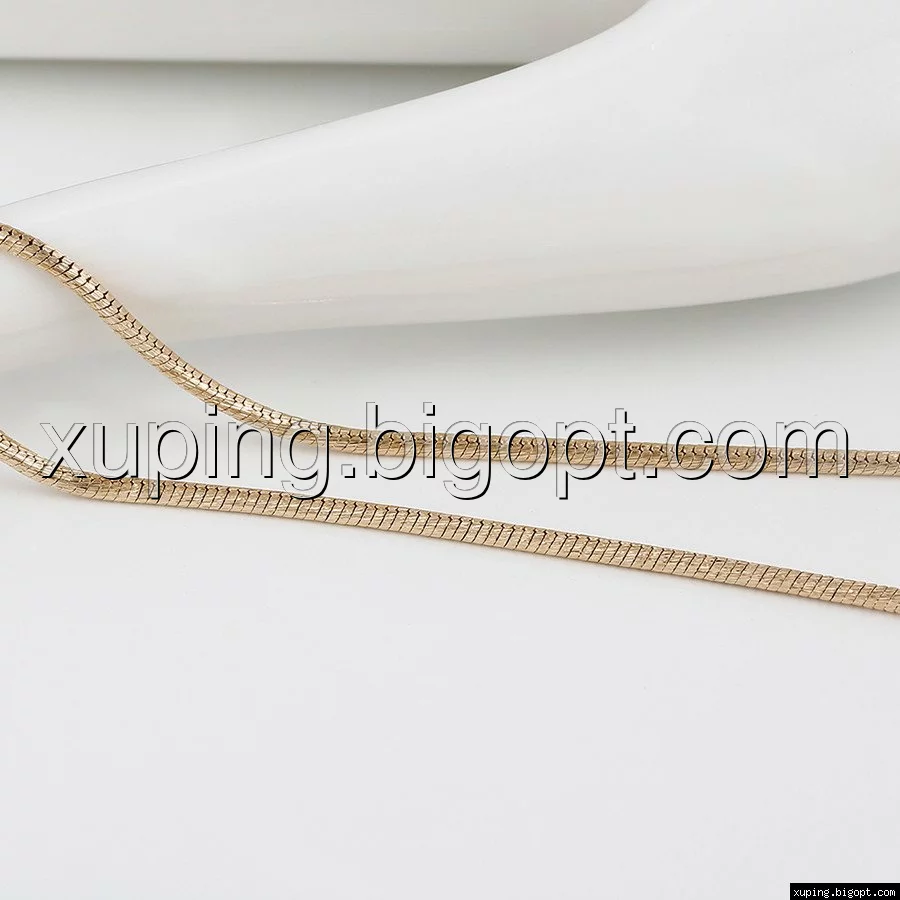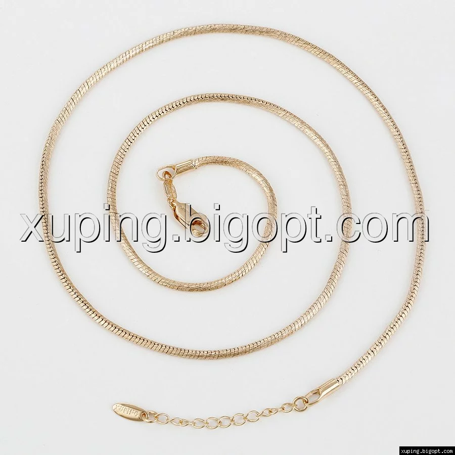 Цепочка выполнена из медицинского сплава на основе латуни с добавлением легирующих элементов, с целью улучшения каких-либо ее свойств, например коррозионной стойкости или прочности. Такой сплав не вызывает аллергии, не вступает в реакцию с потом человека, не меняет свои свойства под воздействием соленой воды и солнца. Поверхность цепочки покрыта золотом 18 карата.