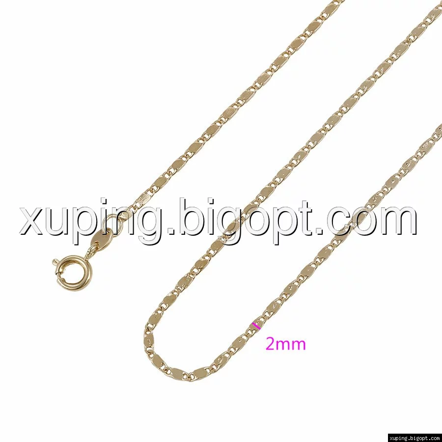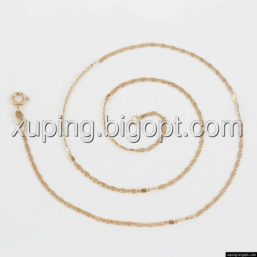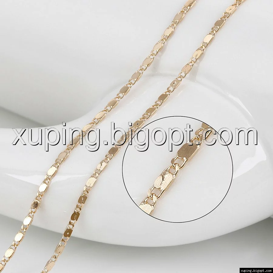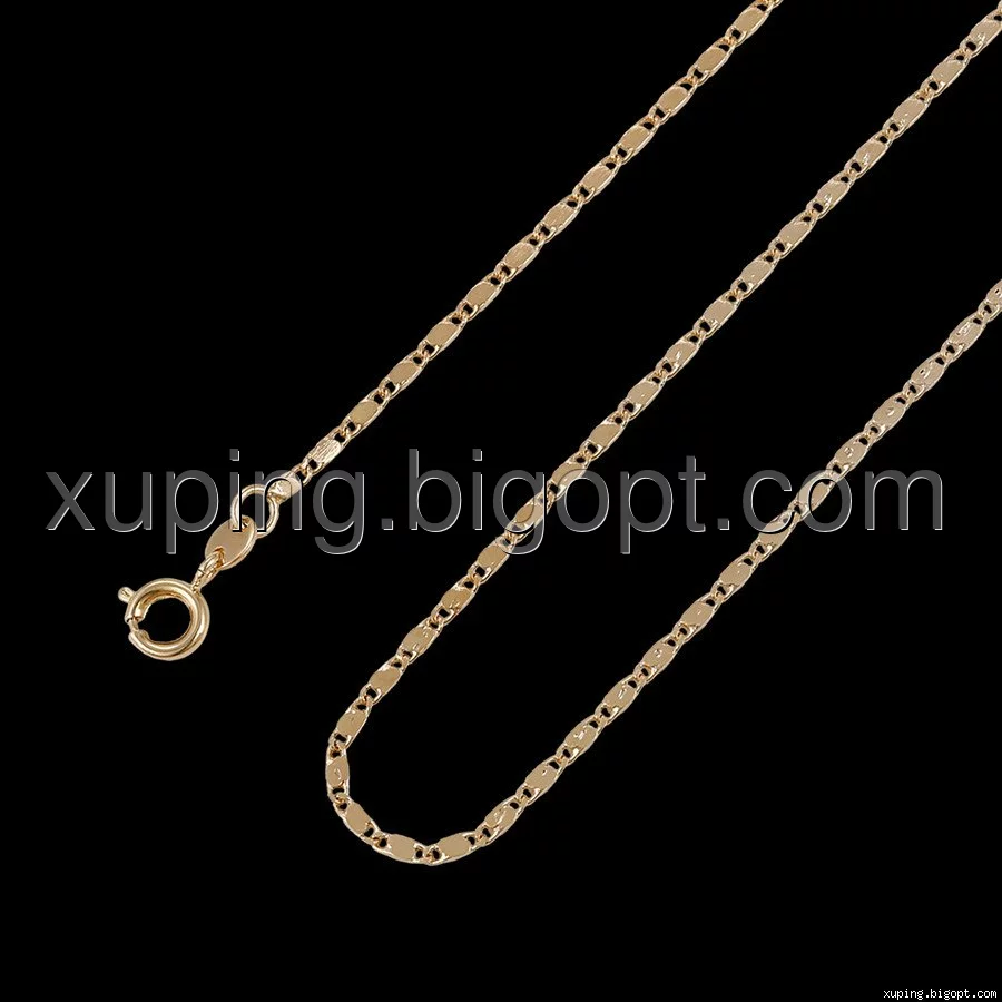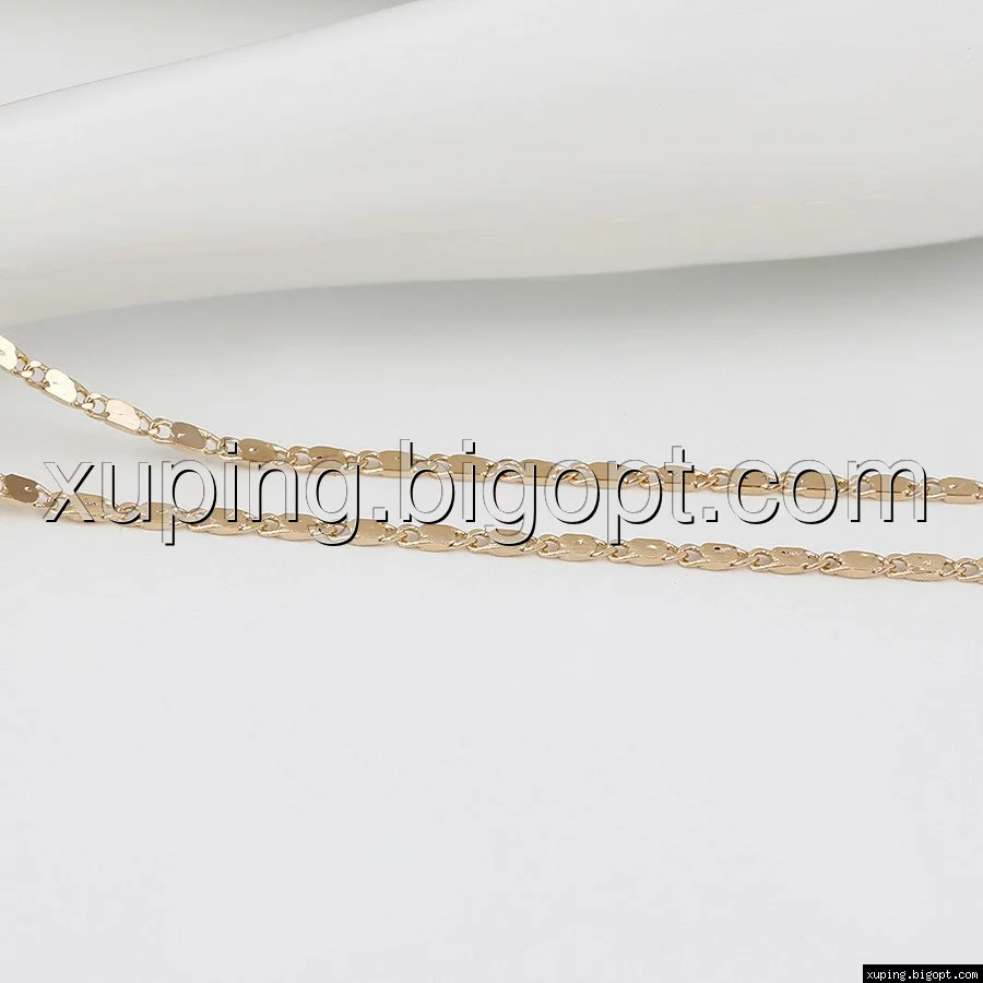 Цепочка выполнена из медицинского сплава на основе латуни с добавлением легирующих элементов, с целью улучшения каких-либо ее свойств, например коррозионной стойкости или прочности. Такой сплав не вызывает аллергии, не вступает в реакцию с потом человека, не меняет свои свойства под воздействием соленой воды и солнца. Поверхность цепочки покрыта золотом 18 карата.
